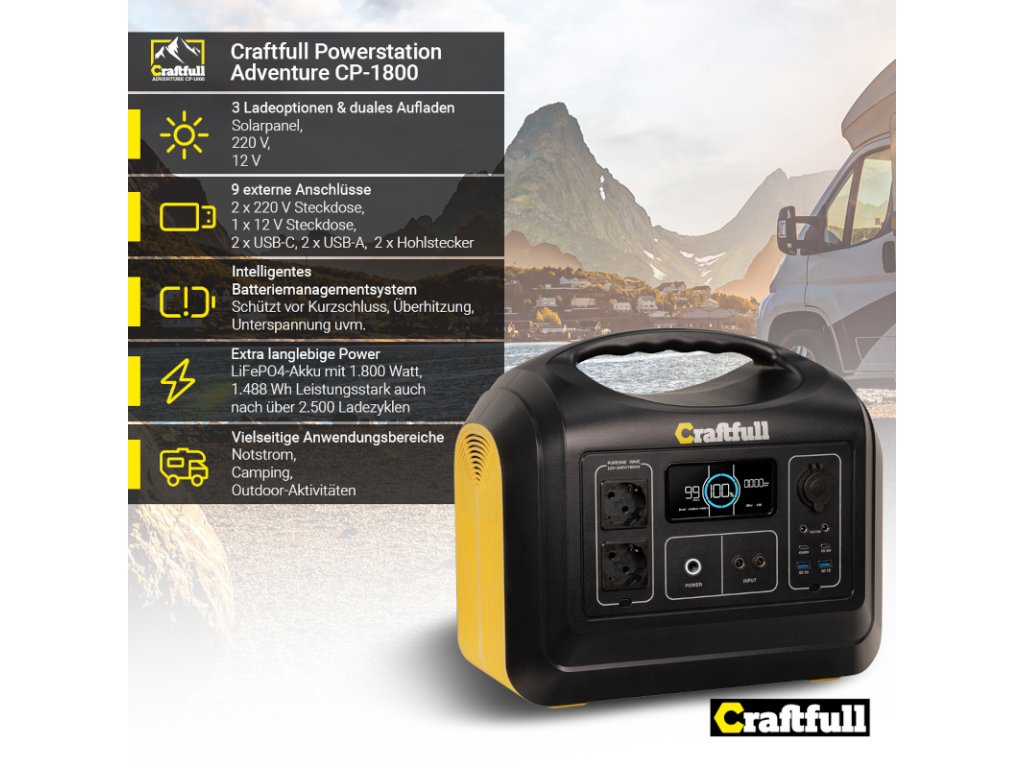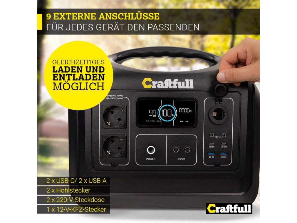 Elektráreň dodáva núdzovú energiu vždy, keď je to potrebné. S Craftfull Powerstation Adventure CP-1800 je ale zabezpečené aj napájanie pre všetky outdoorové aktivity alebo kempingové dovolenky. So siedmimi integrovanými pripojeniami môžete bez problémov ovládať všetky svoje zariadenia.