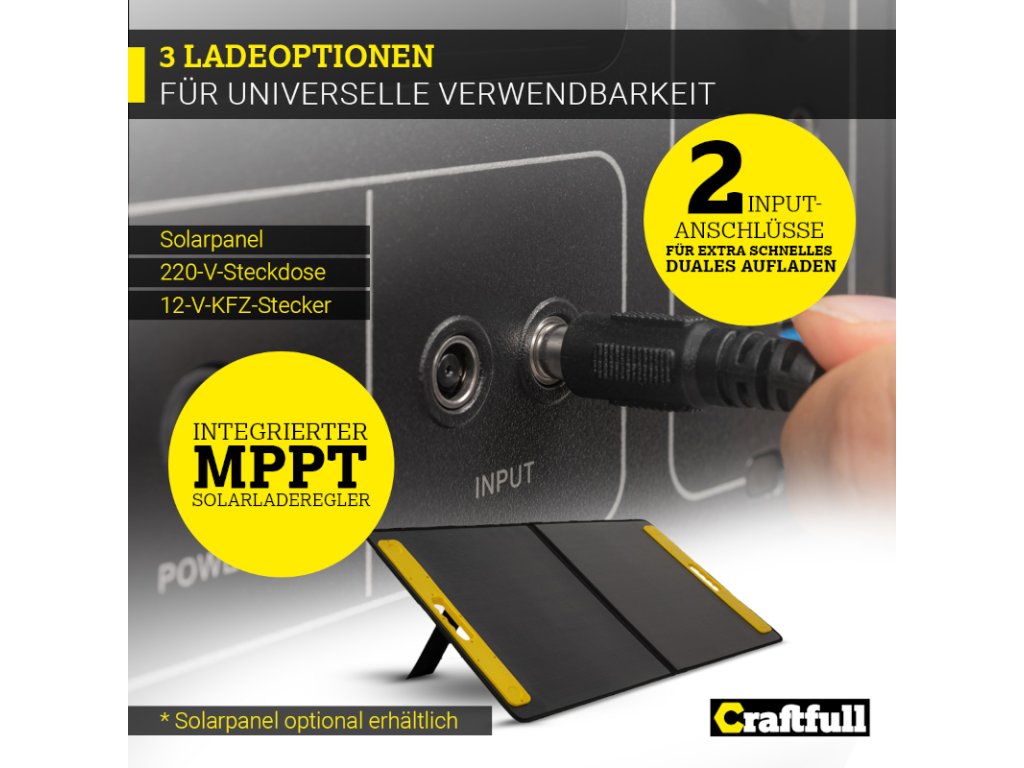 Aby vám nedošla šťava, Craftfull Powerstation Adventure CP-1800 vám ponúka tri možnosti nabíjania. To z nich robí ideálne núdzové napájanie. Pretože nabíjanie nie je možné len prostredníctvom 230 V napájacieho zdroja. S 12 V zástrčkou do auta môžete pohodlne zásobovať elektráreň energiou na každej ceste autom. Alebo môžete využiť silu slnka: V spojení so solárnym modulom sa stávate úplne nezávislými od siete.