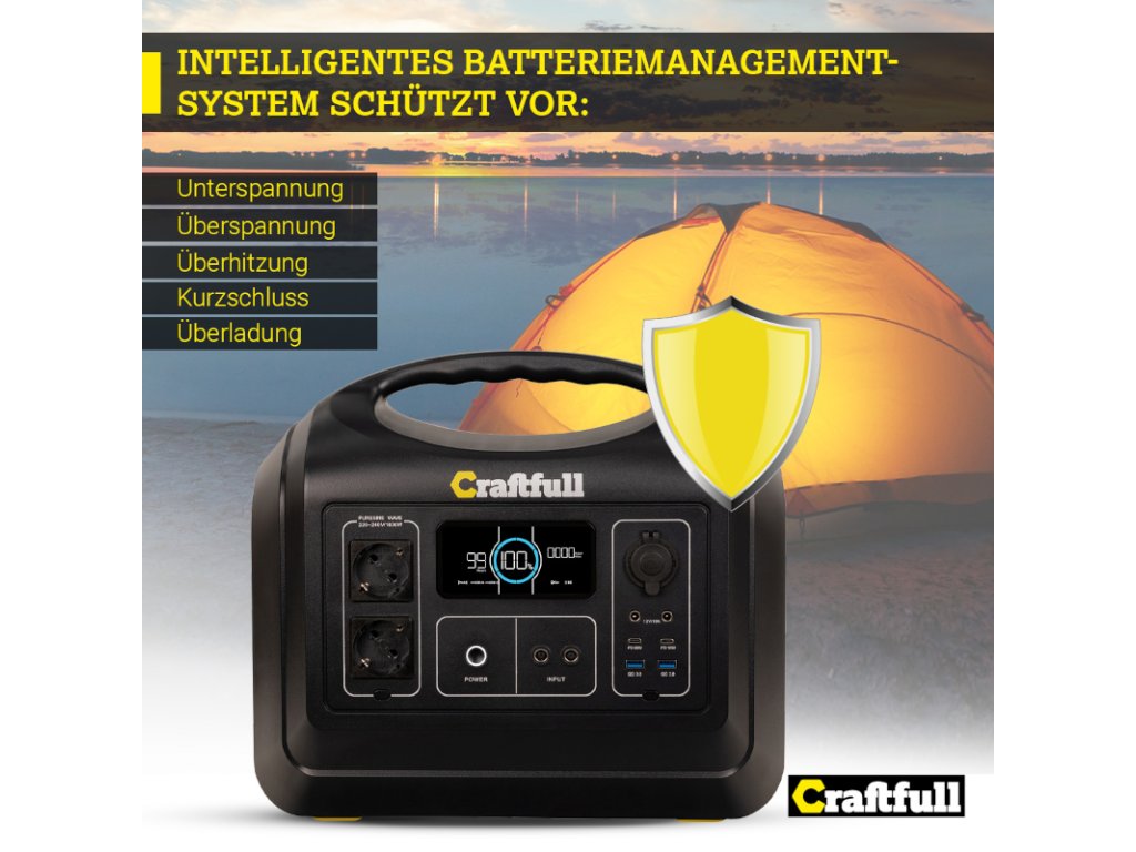 Či už ako núdzové napájanie alebo ako zdroj energie počas dovolenky v kempingu – na Craftfull Powerstation sa môžete spoľahnúť! Zaujme mimoriadne vysokým počtom nabíjacích cyklov s takmer žiadnou stratou výkonu. Komplexný systém správy batérií vrátane ochrany proti prepätiu a ďalších stojí za skvelú funkčnosť nabíjacej stanice.