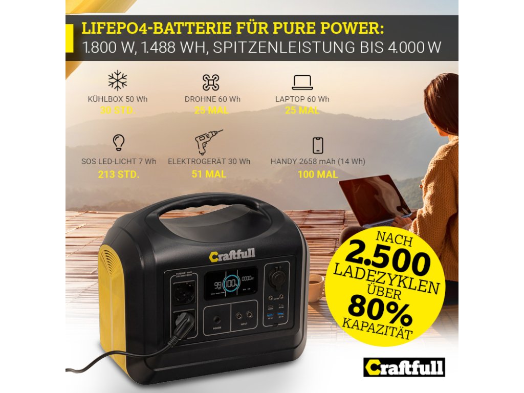 Kapacita LiFePO4 batérie je aj po 2 500 nabíjacích cykloch stále väčšia ako 80 % . Vydrží asi 5x dlhšie ako porovnateľné lítium-iónové batérie od konkurencie. Využite výhody tejto vysokej kvality. Craftfull Powerstation CP- 1800 je dlhodobá investícia smerom k napájaniu nezávislému od siete.