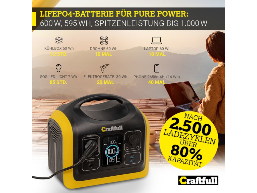 S Craftfull Powerstation Adventure CP-600 ste na bezpečnej strane. Kapacita 595 Wh vám poskytne dostatok energie pre všetky zariadenia.