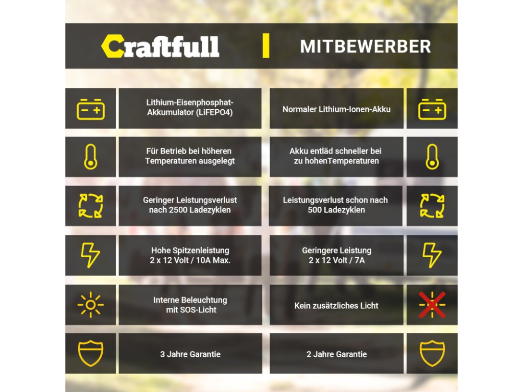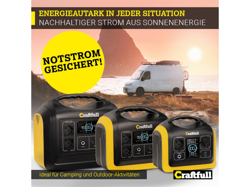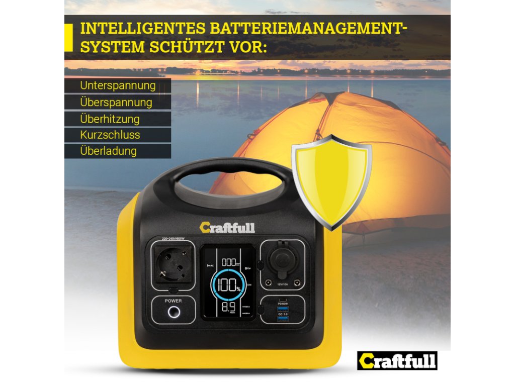 Či už ako núdzové napájanie alebo ako zdroj energie počas dovolenky v kempingu – na Craftfull Powerstation sa môžete spoľahnúť! Zaujme mimoriadne vysokým počtom nabíjacích cyklov s takmer žiadnou stratou výkonu. Komplexný systém správy batérií vrátane ochrany proti prepätiu a ďalších stojí za skvelú funkčnosť nabíjacej stanice.