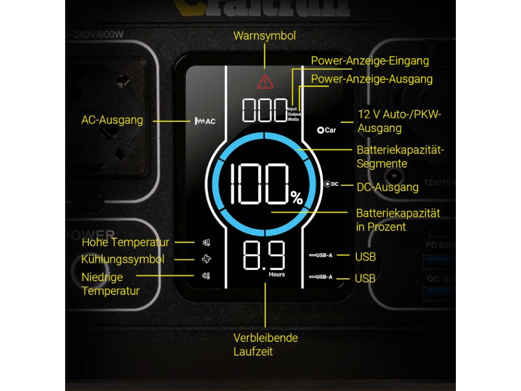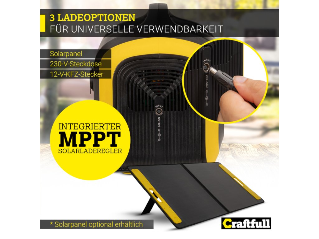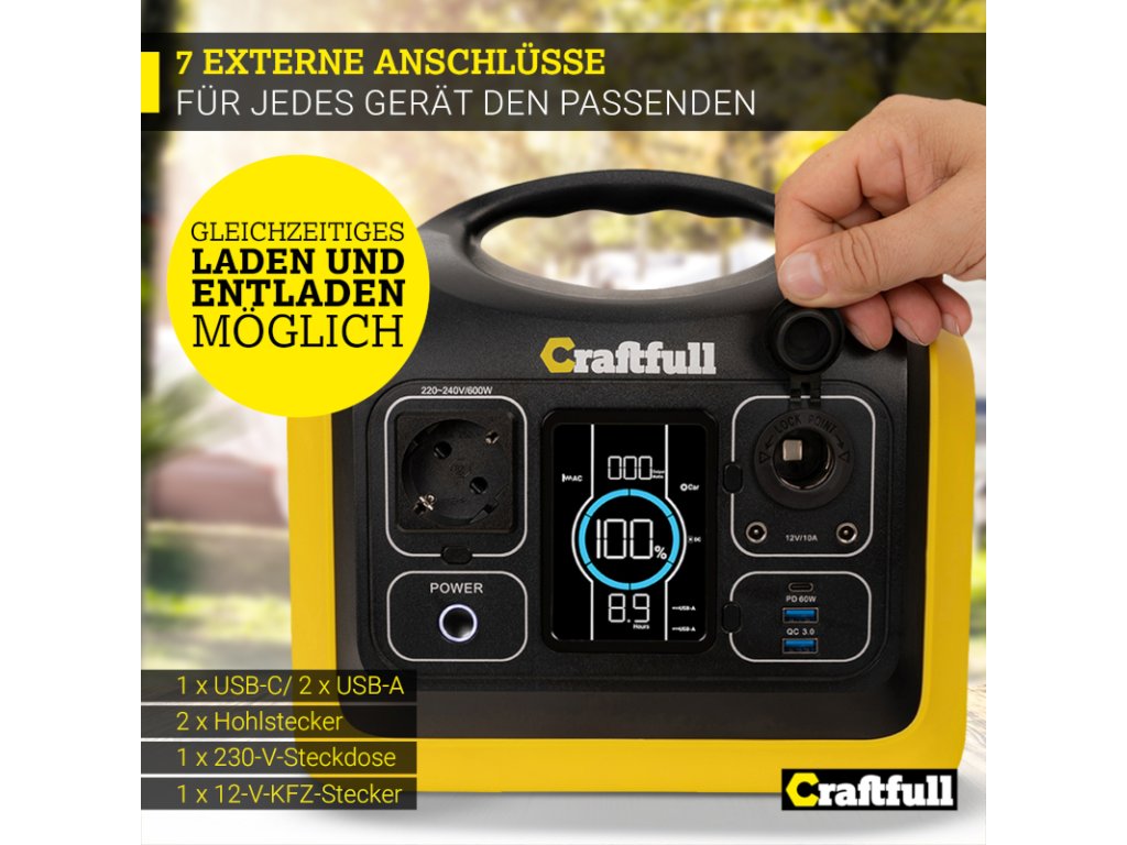 Aby vám nedošla šťava, Craftfull Powerstation Adventure CP-600 vám ponúka tri možnosti nabíjania. To z nich robí ideálne núdzové napájanie. Pretože nabíjanie nie je možné len prostredníctvom 230 V napájacieho zdroja. Pomocou 12 V autozástrčky môžete pohodlne zásobovať nabíjaciu stanicu energiou na každej ceste autom.