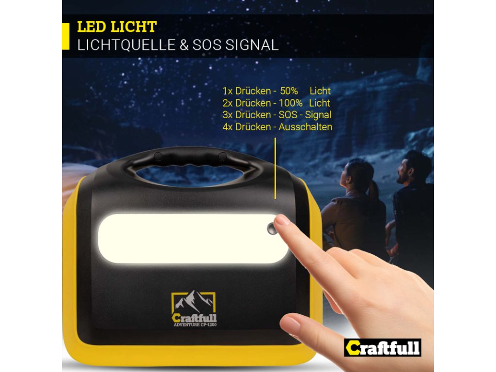Pri LED svetle si môžete vybrať z dvoch úrovní jasu. A dokonca sa myslelo aj na signál SOS. Či už osvetlenie v prípade výpadku prúdu alebo ako lampa v stane: užitočná funkcia dopĺňa Craftfull Powerstation Adventure CP-600.
