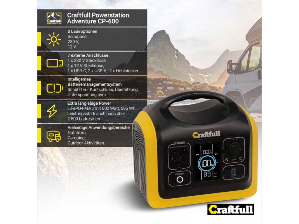Elektráreň dodáva núdzovú energiu vždy, keď je to potrebné. S Craftfull Powerstation Adventure CP-600 je ale zabezpečené aj napájanie pre všetky outdoorové aktivity alebo kempingové dovolenky. So siedmimi integrovanými pripojeniami môžete bez problémov ovládať všetky svoje zariadenia.