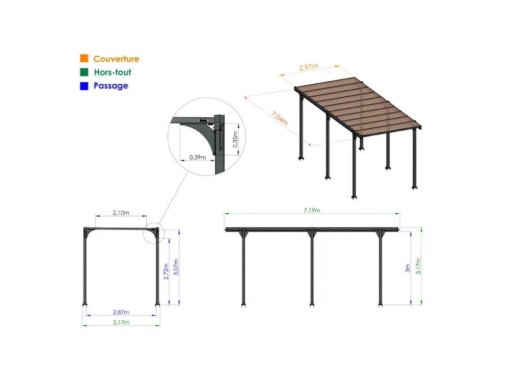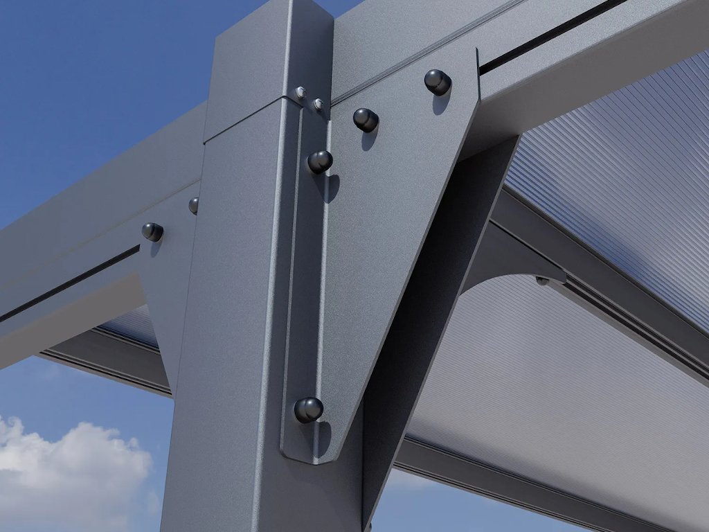 Prístrešok na auto Trigano Hegoa 20 XL bol navrhnutý tak, aby bol pevný a odolný. Vysoko kvalitné hliníkové stĺpiky a priečniky sú navrhnuté tak, aby ponúkali neporovnateľnú odolnosť voči korózii a búrkam až do rýchlosti 90 km/h! Strecha unesie až 10 cm utlačeného a mokrého snehu, t.j. zaťaženie 40 kg/m². Lakovanie všetkých konštrukčných prvkov má zrnitú štruktúru, ktorá zabraňuje korózii niekoľkých oceľových častí a vzniku škrabancov. Súčasťou sú nerezové skrutky a upevňovacie prvky na ukotvenie do zeme. Dažďová voda je účinne odvádzaná pomocou tyčí umiestnených v spodnej časti sklonu strechy aby sa mikroúlomky nedostali do polykarbonátových dosiek a nenarušili ich krásny vzhľad degradáciou. Navrhnuté a vyrobené vo Francúzsku.