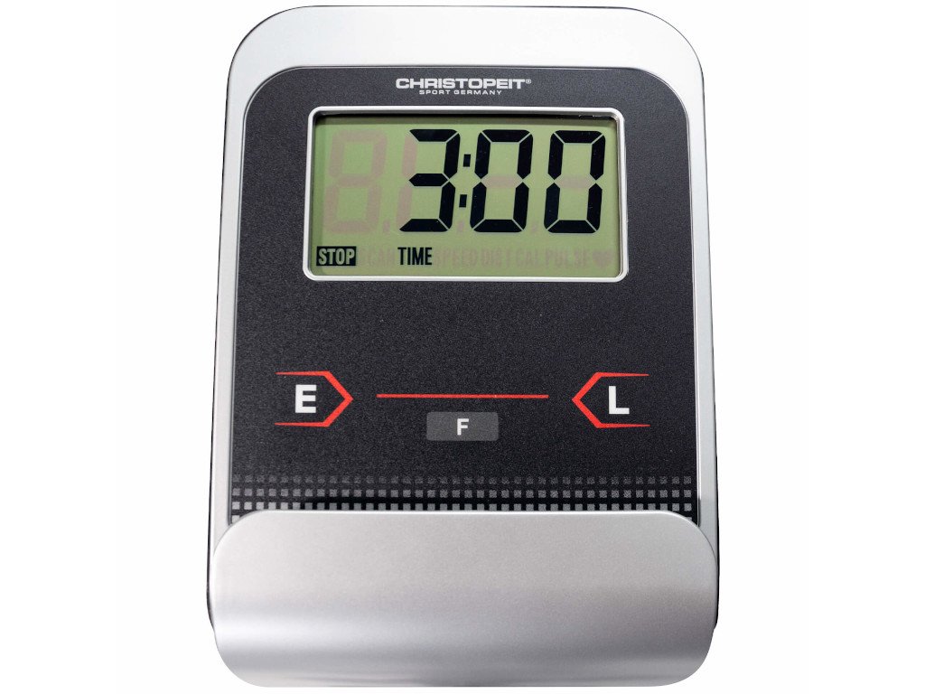 LCD displej striedavo zobrazuje čas, rýchlosť, vzdialenosť, približnú spotrebu kalórií a pulz. Pomocou ručných snímačov pulzu v rukoväti môžete sledovať pulz počas tréningu.