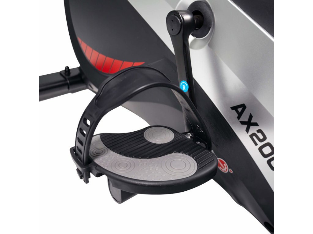 Protišmykové pedále s nastaviteľným bezpečnostným popruhom zaisťujú optimálnu priľnavosť a vysokú úroveň bezpečnosti. Na jednoduchú prepravu medzi rôznymi miestami na cvičenie slúžia transportné kolieska. Vyrovnávače nerovností podlahy sú umiestnené na zadnom stabilizátory.