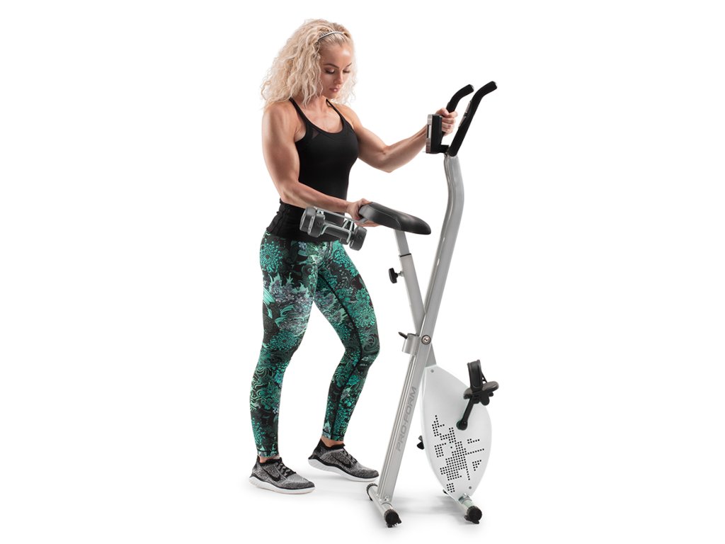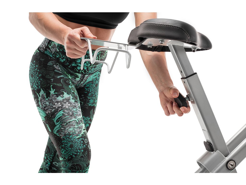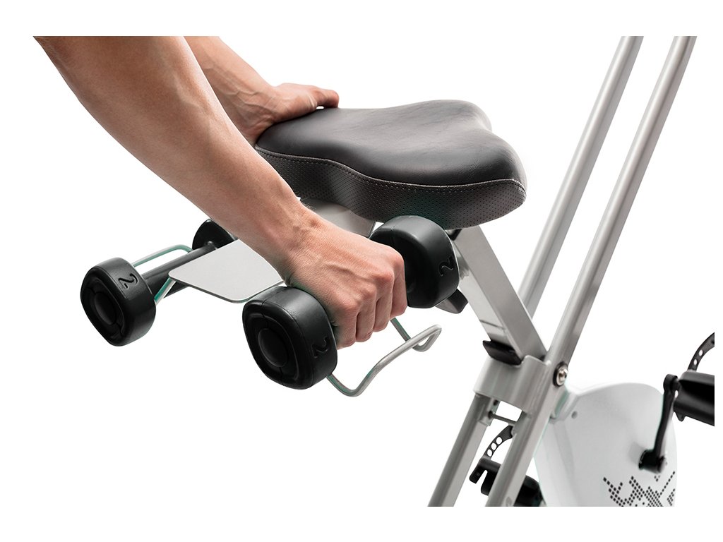 Milovníci športu, ktorí v domácej telocvični bojujú s každým centimetrom navyše, očarí jeho blesková možnosť zloženia. Ak patríte k populácii veľkých, malých, tenkých či zavalitých je tento stroj s maximálnou nosnosťou 115 kg a ľahko nastaviteľným sedlom určený práve pre vás. Magnetický brzdný systém s plynulou elektronickou reguláciou a perfektne vyvážený zotrvačníkový systém s hmotnosťou 3 kg zaisťuje plynulý a tichý chod stoja.