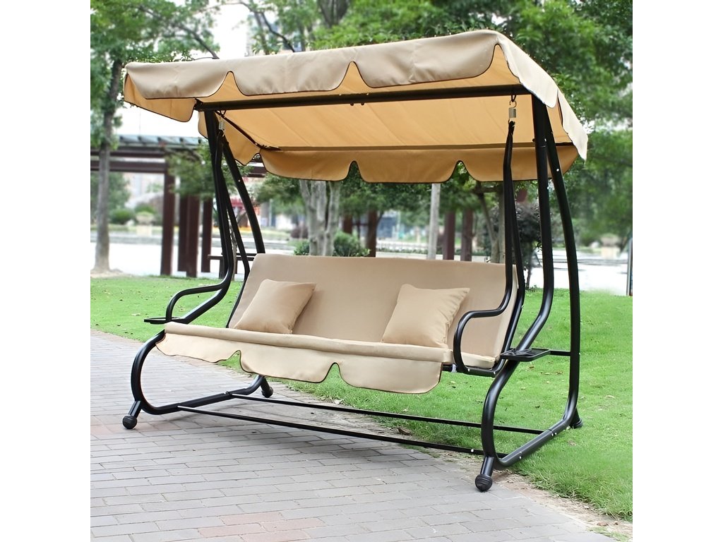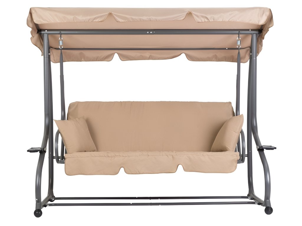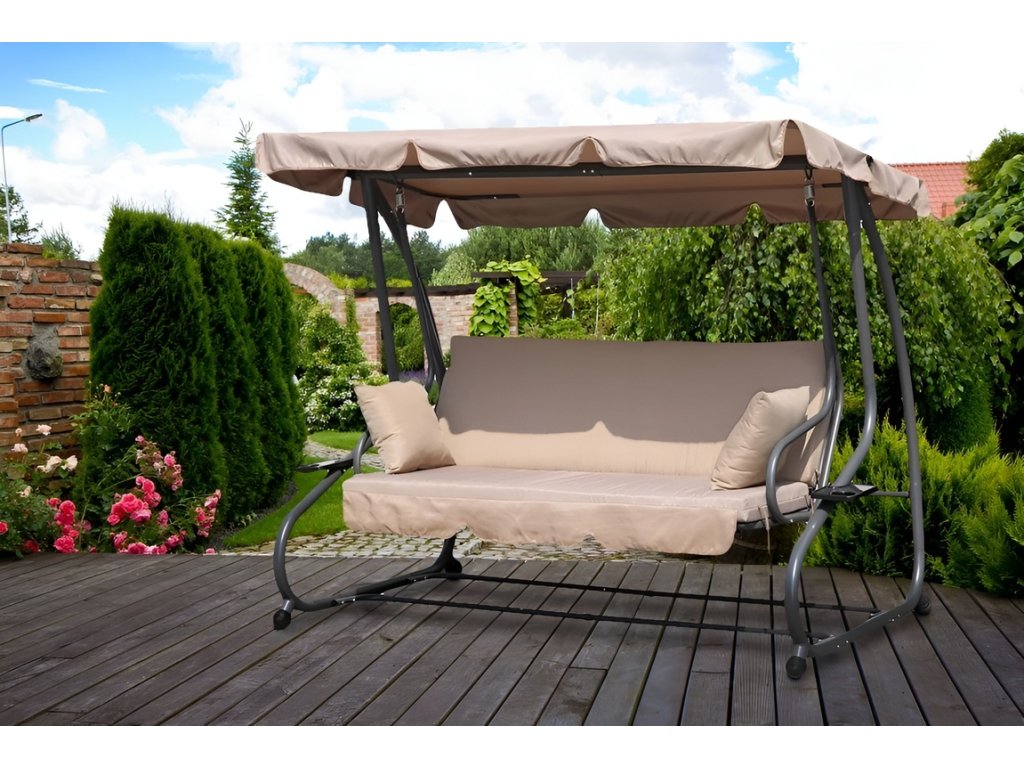 Táto záhradná hojdačka je perfektnou voľbou pre každú domácu záhradu. Vďaka modernému dizajnu a možnosti sklápania je pohodlným miestom pre tri osoby. Dodáva sa s mäkkým matracom a dvoma vankúšmi a jej maximálna nosnosť je 300 kg. Odolný oceľový rám hojdačky je odolný voči poveternostným vplyvom. Okrem toho má dva praktické držiaky na nápoje a občerstvenie a nastaviteľnú striešku s ozdobným volánikom pre väčšie pohodlie.