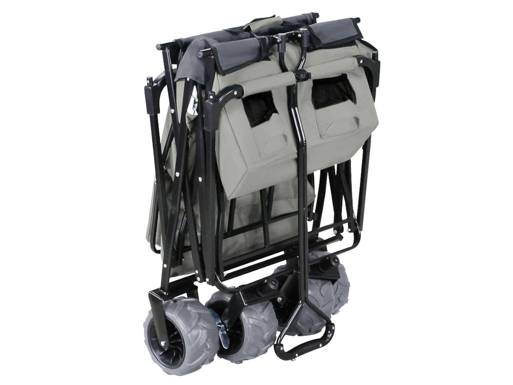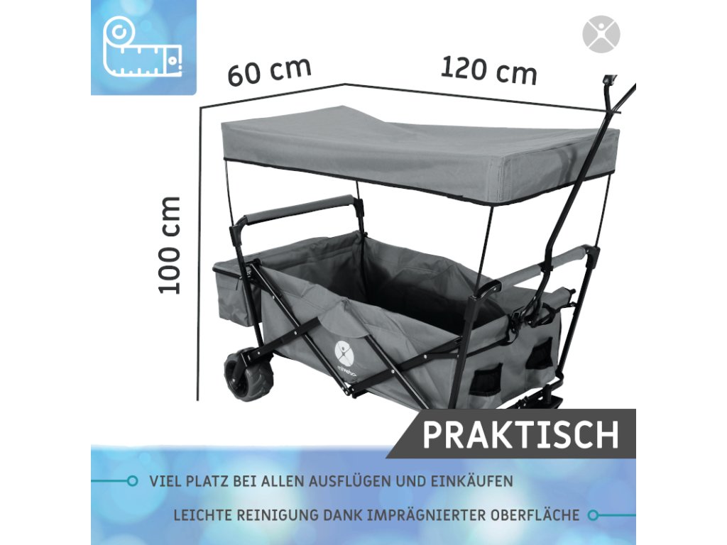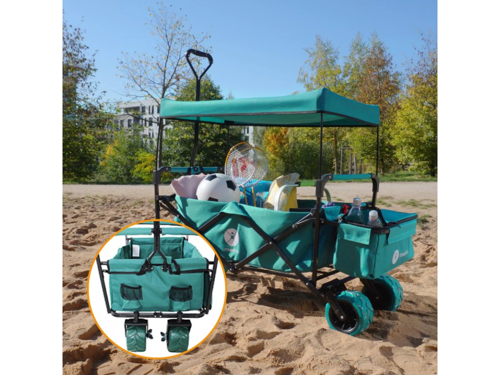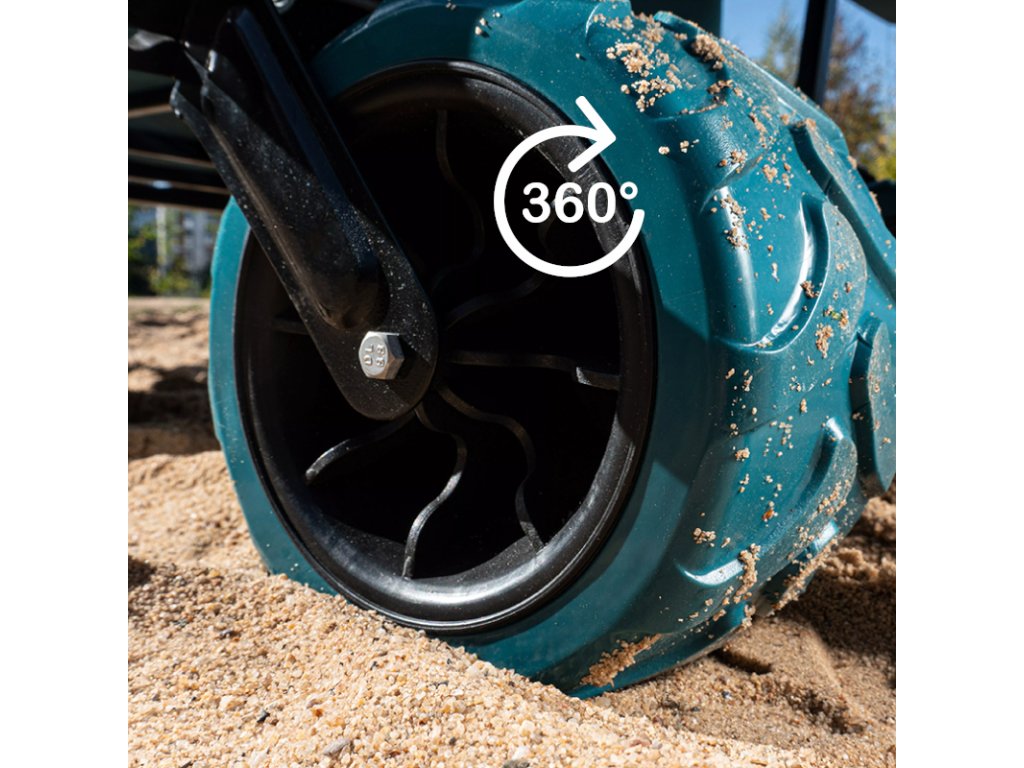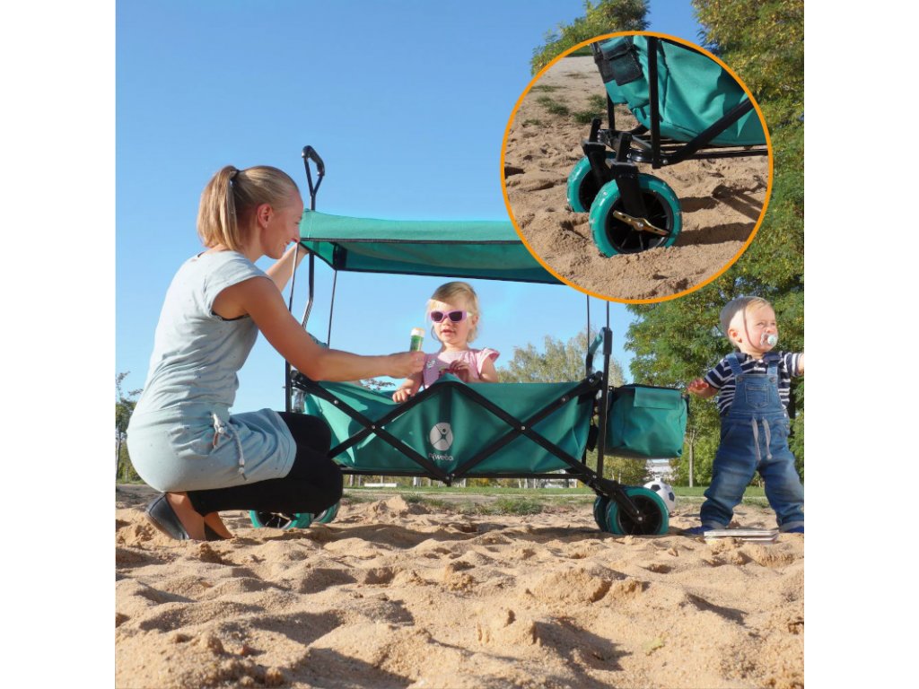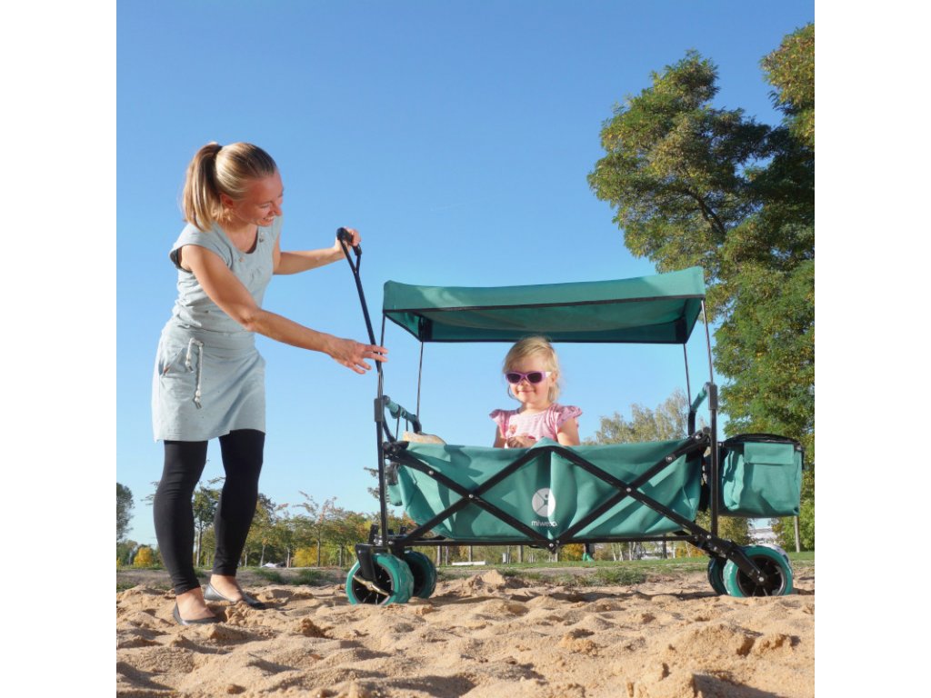 Vysokokvalitné, obzvlášť široké pneumatiky si mimoriadne ľahko riadia. Bez problémov zvládnete akýkoľvek povrch. Pomocou 360-stupňových otočných kĺbov na predných kolesách zvládnete všetky jazdné manévre bez komplikácií. Vďaka praktickým vreckám budete mať opaľovací krém, občerstvenie a hračky vždy po ruke. Ručný vozík je dobre polstrovaný, aby sa vaše deti cítili pohodlne. Skladací ručný vozík sa dá tiež zložiť, aby sa ušetrilo miesto, keď sa výlet skončí.