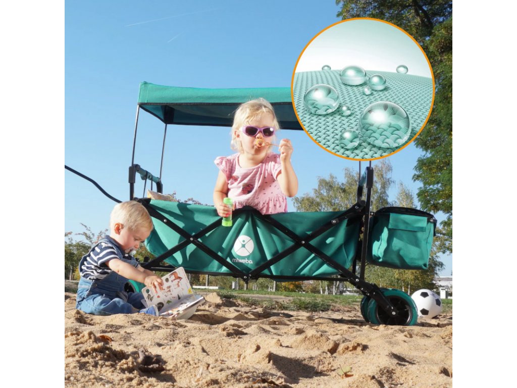 Ručný vozík Miweba MB-10 je vybavený praktickou strieškou, aby si deti mohli užívať teplé dni. Je to praktické, pretože sa dá rýchlo odstrániť. Jednoducho odstráňte strechu, zatiahnite strešné tyče a ručný vozík je pripravený na ďalšie miesto určenia. Vaše ratolesti sa určite budú tešiť na vzrušujúcu prehliadku s ručným vozíkom.