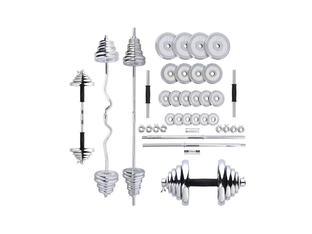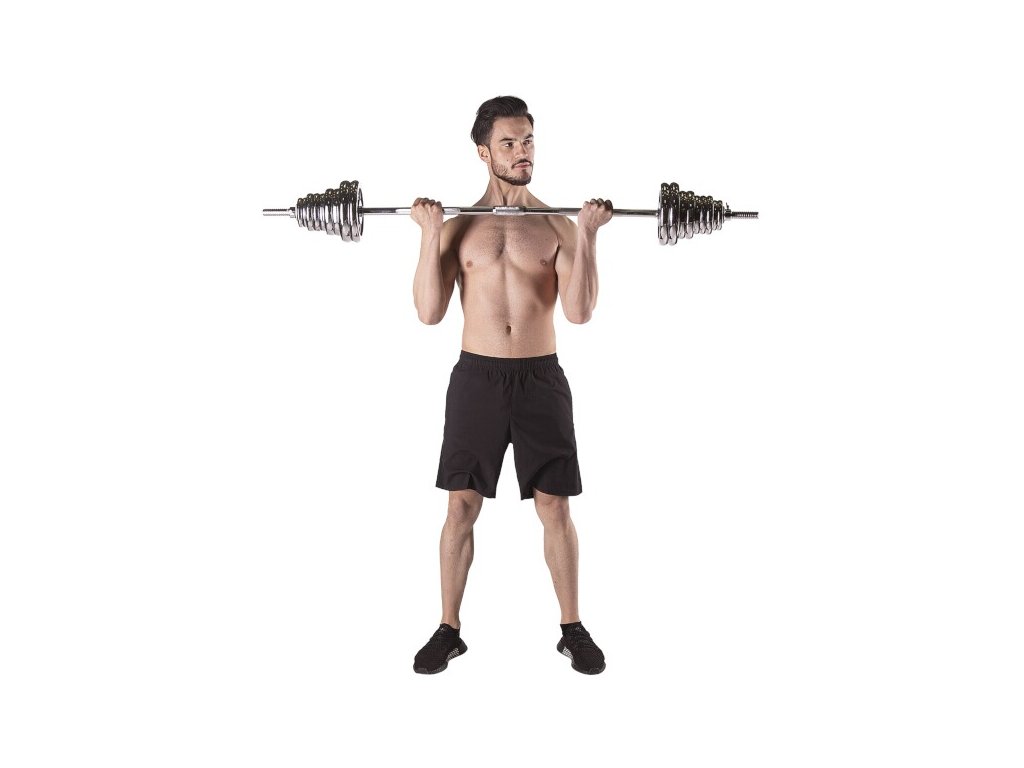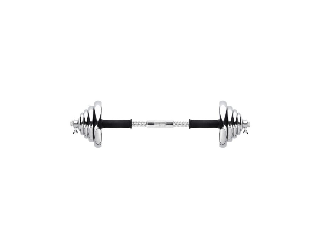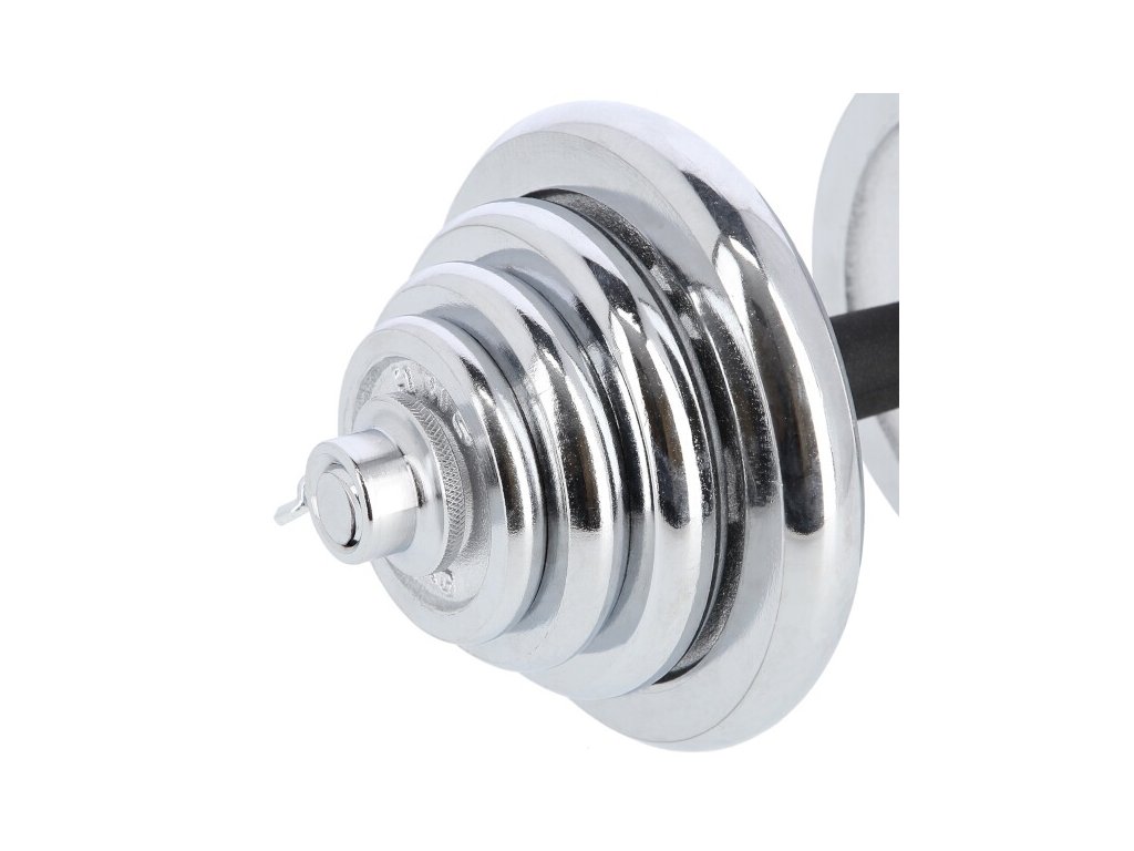Činky sú vyrobené z vysoko kvalitnej chrómovanej ocele, ktorá zabezpečuje ich dlhú životnosť. Disky sú spoľahlivo upevnené skrutkovými zámkami, ktoré sú dodatočne zaistené krídlovou maticou.