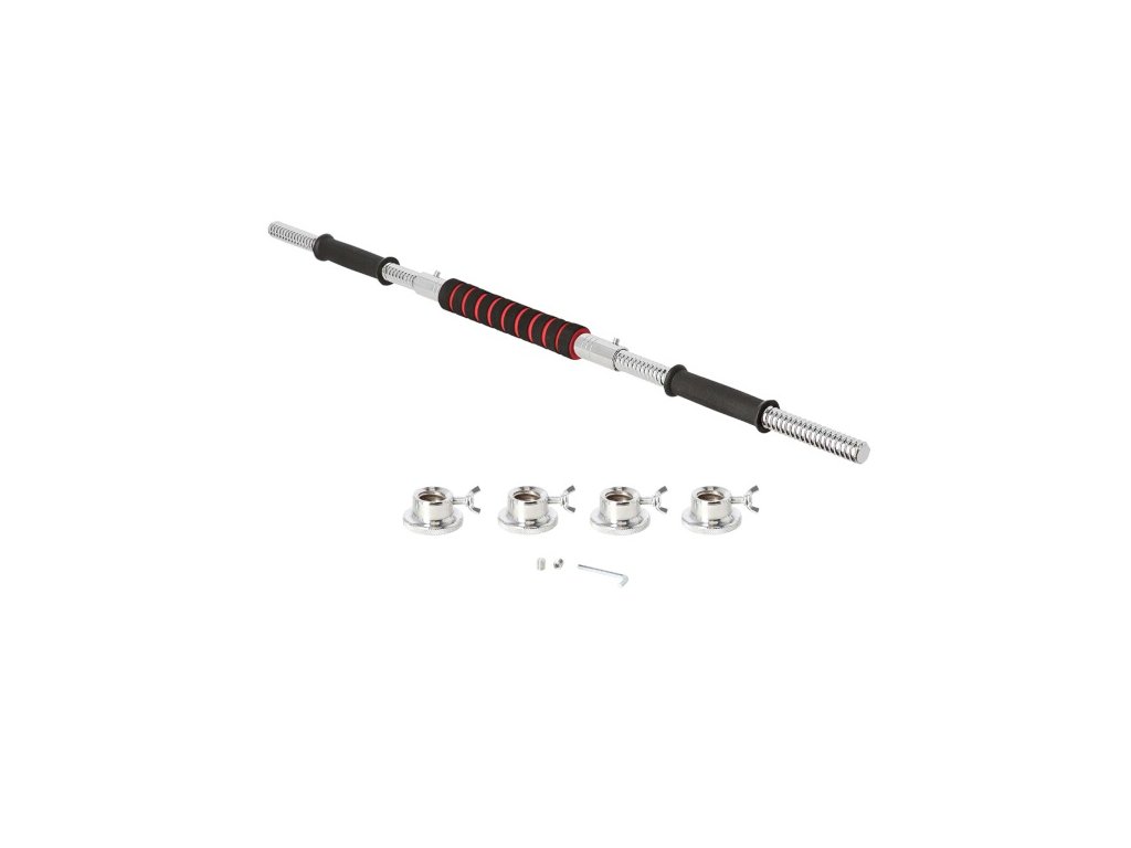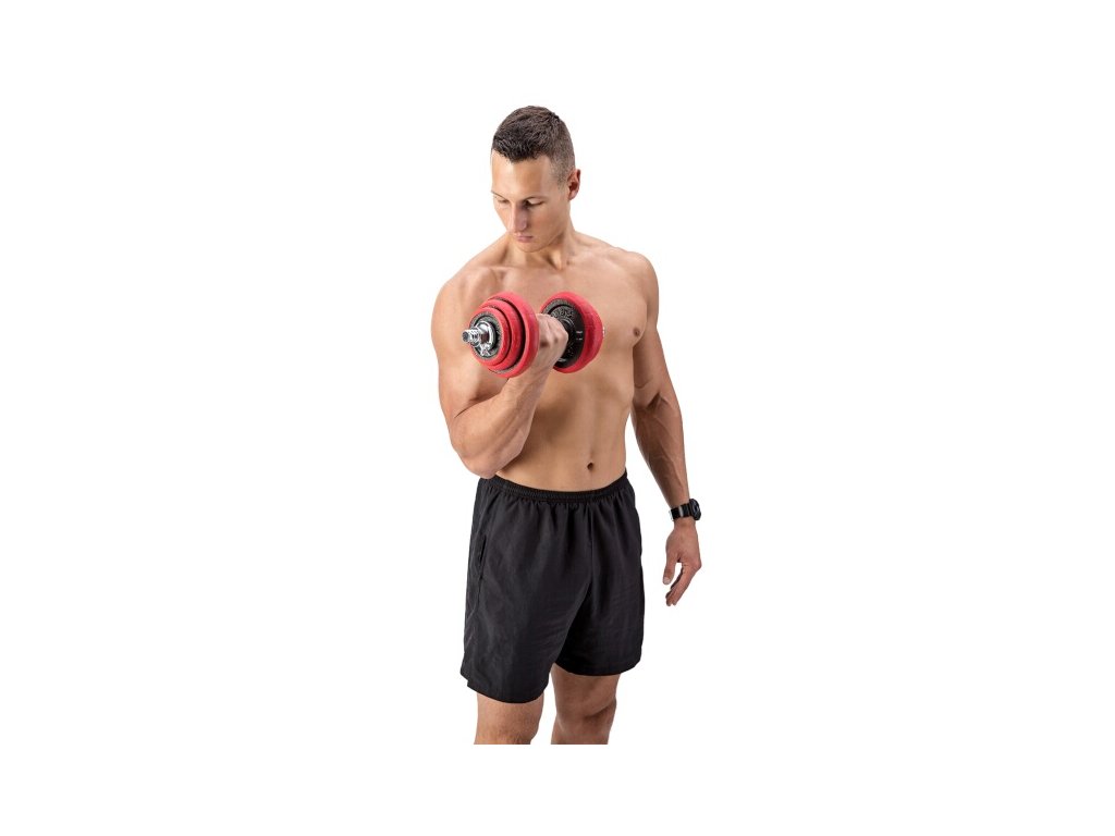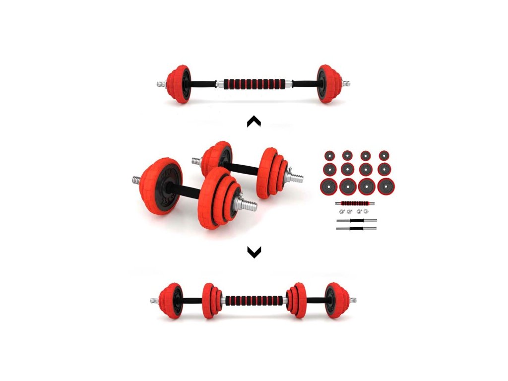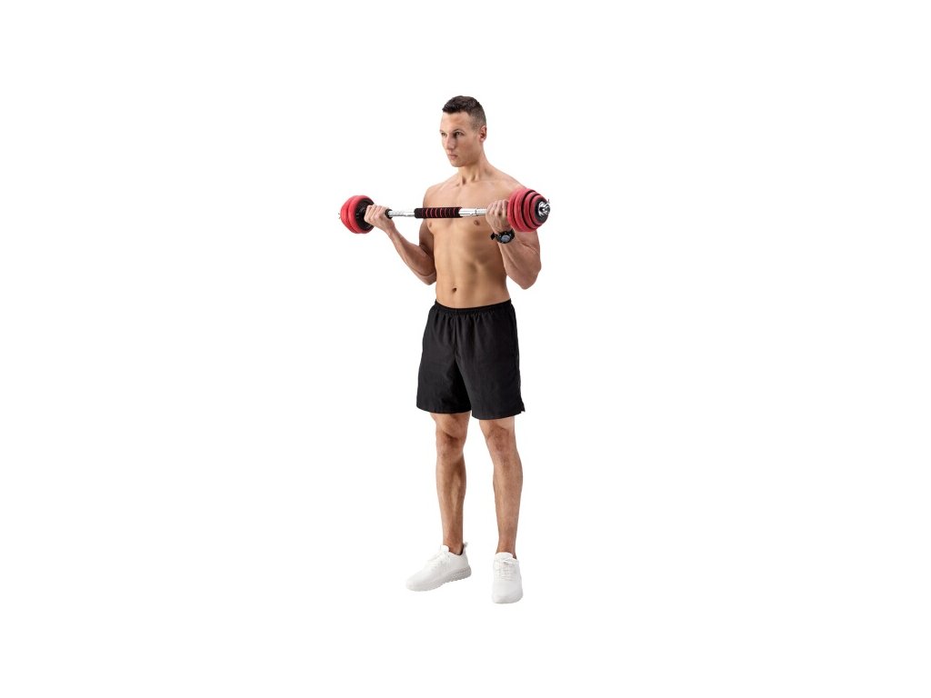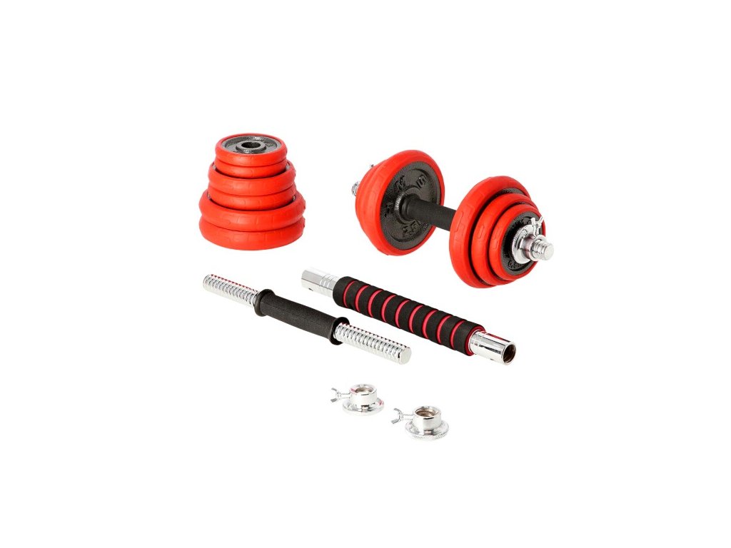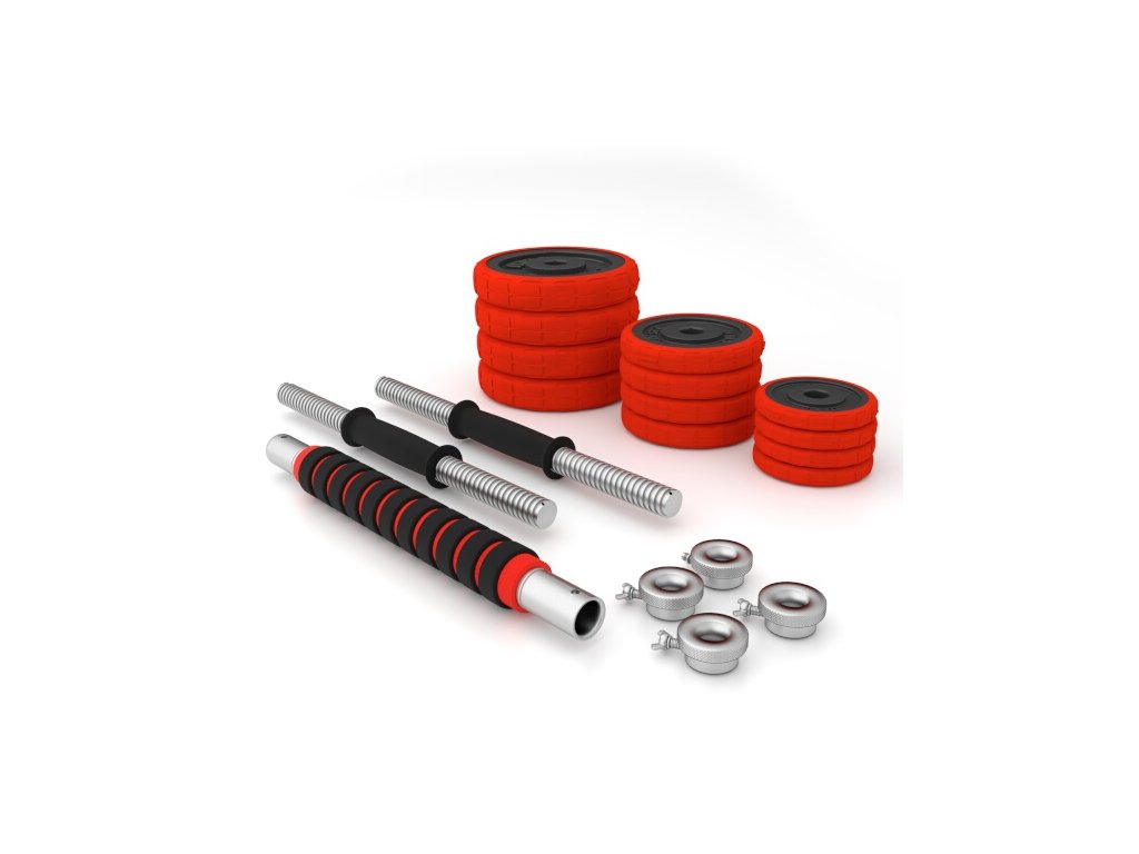Súprava sa dodáva so spojovacím dielom, pomocou ktorého môžete spojiť nakladacie osi a vytvoriť tak jednu obojručnú činku. Činky sú vyrobené z kvalitnej liatej ocele, ktorá zaručuje dlhú životnosť. Kotúče sú vybavené gumovým puzdrom, ktoré chráni činky aj podlahu pred poškodením pri neopatrnom odložení. Činky sú zabezpečené proti posunu závažia pomocou skrutkových zámkov, ktoré sú navyše zaistené skrutkou.Súprava obsahuje 2 krátke nakladacie osi vybavené ergonomickou rukoväťou, spojovací diel, 4 zámky a 12 kotúčov.