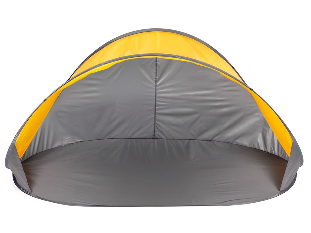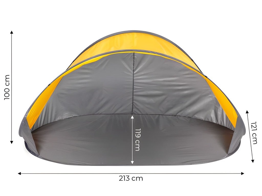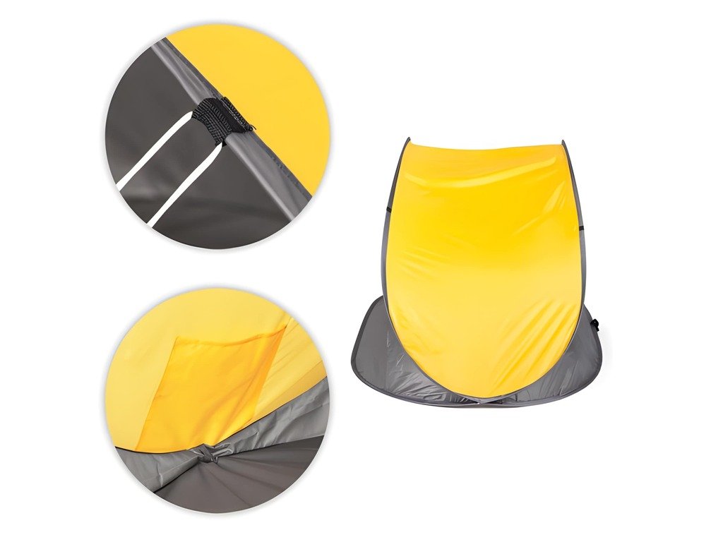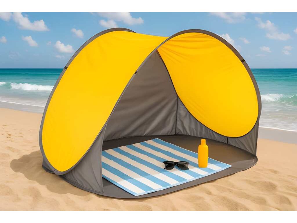 Tento plážový stan poskytuje účinnú ochranu pred slnkom, miernym vetrom a pieskom. Vďaka systému samomontáže sa dá postaviť v priebehu niekoľkých sekúnd – bez námahy a bez náradia. Konštrukcia stanu je založená na 5,5 mm hrubom ráme zo sklenených vlákien, ktorý zaisťuje stabilitu a nízku hmotnosť. Strieška z polyesteru 190T s PA poskytuje odolnosť voči vlhkosti a UV žiareniu. Vo vnútri stanu sa nachádza praktické vrecko – ideálne na telefón, kľúče alebo iné drobnosti, ktoré chcete mať poruke. Stan má všité kotviace body pre bezpečné ukotvenie k zemi. Sada obsahuje kolíky, laná a prenosnú tašku s rukoväťou.