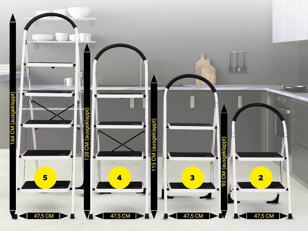 Vyberte si rebrík s dvoma, tromi, štyrmi alebo piatimi schodíkmi v závislosti od vašich potrieb. To vám umožní dosiahnuť pracovnú výšku až 248 cm, 272 cm, 296 cm alebo 320 cm.