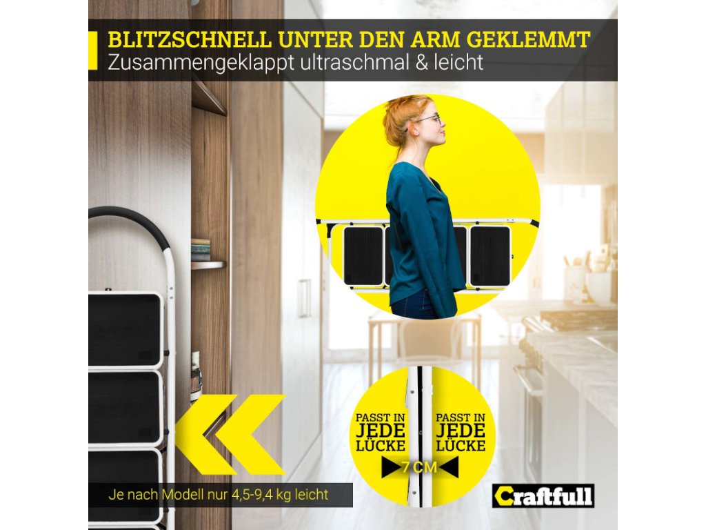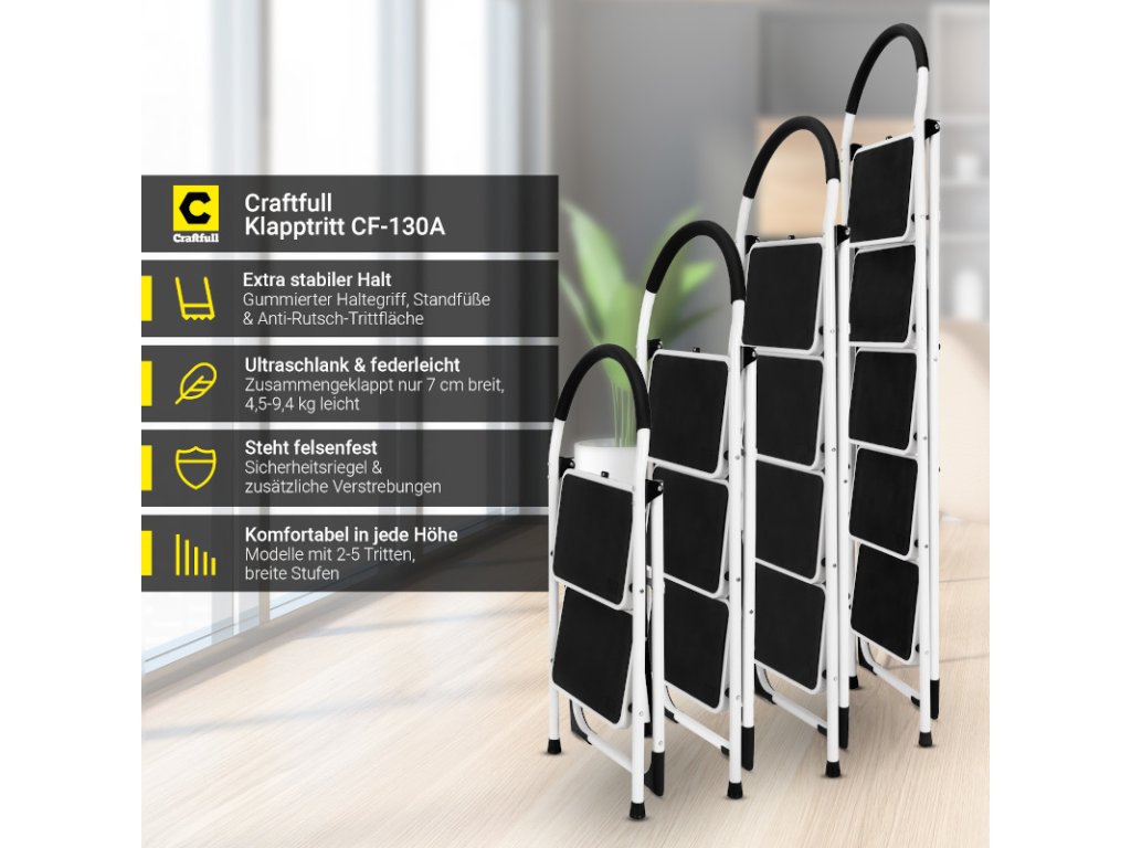 Skladací rebrík Craftfull CF-130A boduje úzkou šírkou len 7 cm. Ľahko sa zmestí do voľného priestoru v pivnici alebo v sklade. Veľmi jednoduchá je aj preprava na iné miesto použitia. Rebrík pre domácnosť v závislosti od jeho veľkosti neváži viac ako 4,5 – 9,4 kg a dá sa rýchlo a jednoducho preniesť.