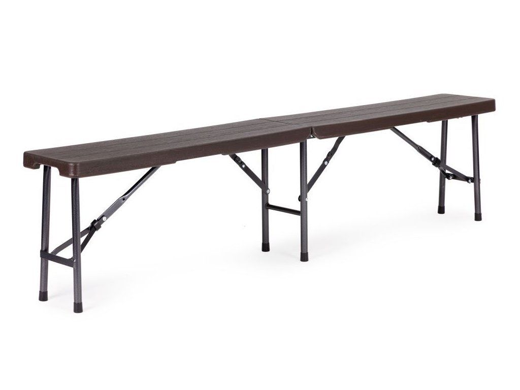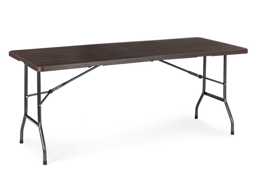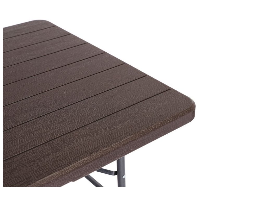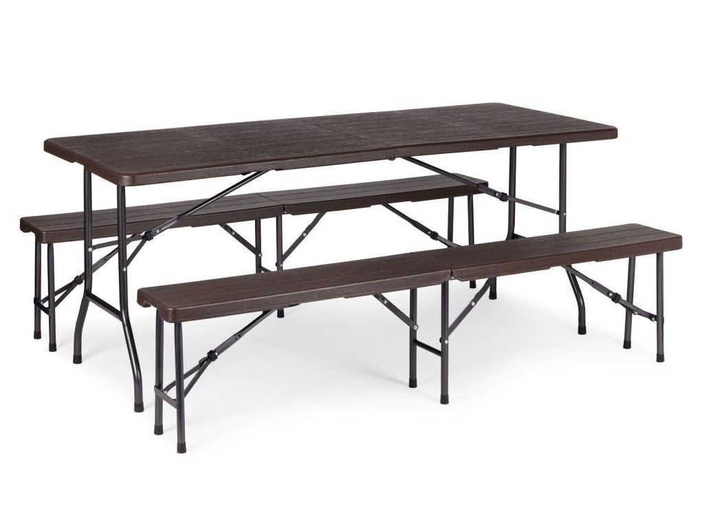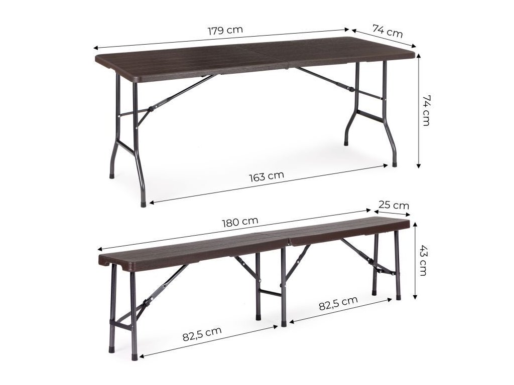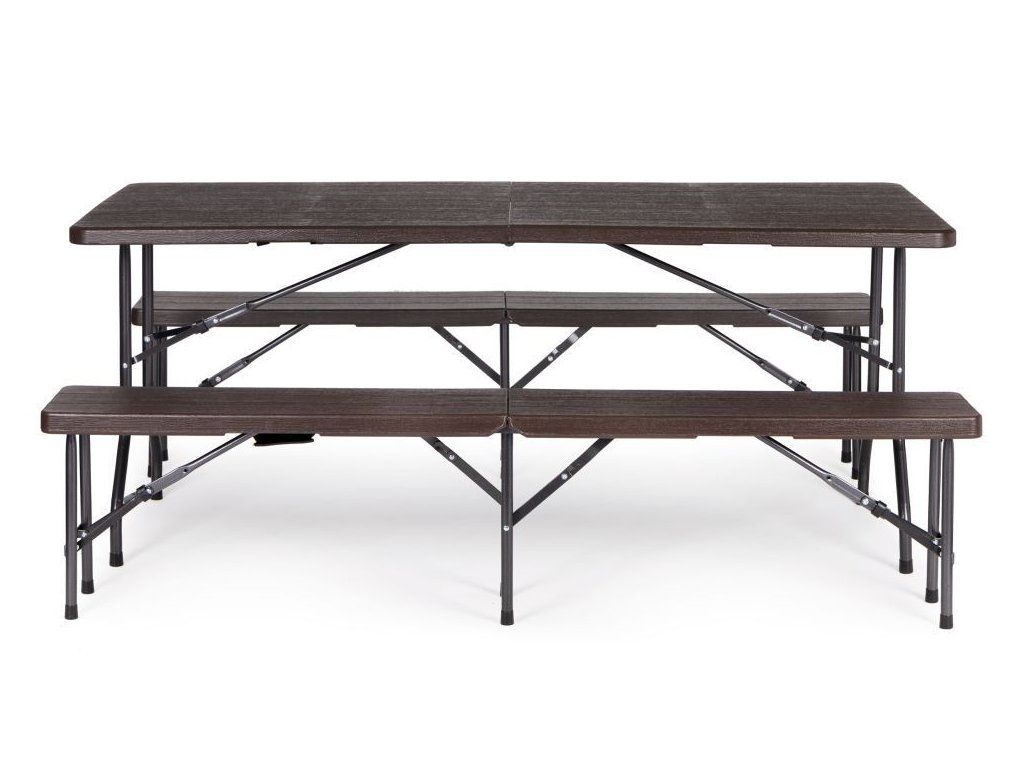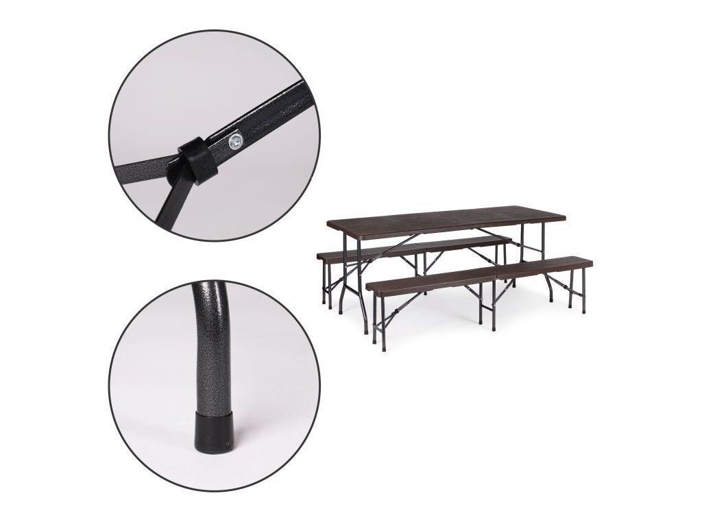 Táto 8-miestna jedálenská súprava pozostáva z cateringového stola a dvoch lavíc . Súprava má pevný kovový rám , zatiaľ čo doska stola a sedadlá v ratanovom štýle sú vyrobené z odolného HDPE . Stôl a lavice majú uzamykací mechanizmus, ktorý zabraňuje náhodnému zloženiu . Súpravu je možné zložiť aj do kufra pre jednoduchú prepravu. Medzi ďalšie vlastnosti patria rukoväte na prenášanie a nohy s ochrannými pätkami. Nábytok je odolný voči poveternostným vplyvom. Nohy stola majú priemer 25 mm a lavice majú priemer 22 mm a maximálne zaťaženie stola je 100 kg.