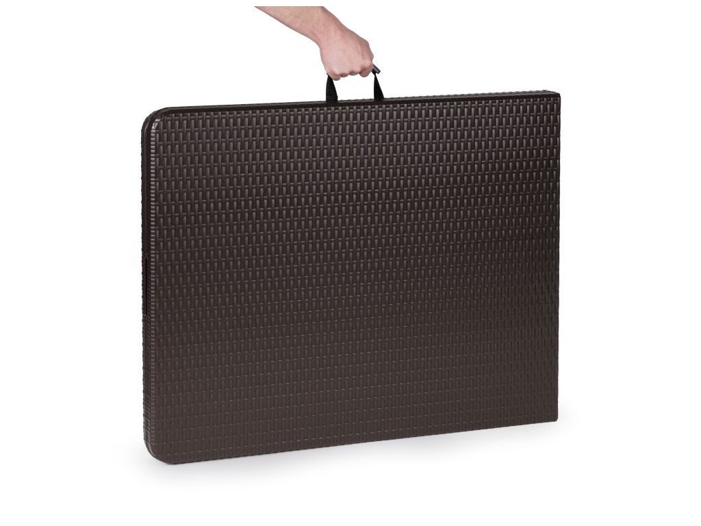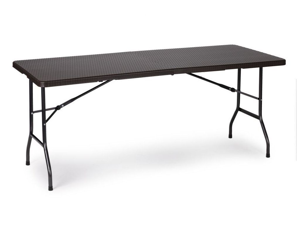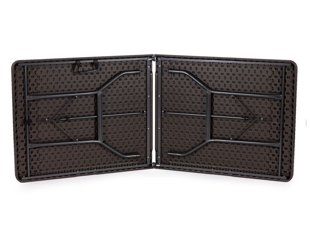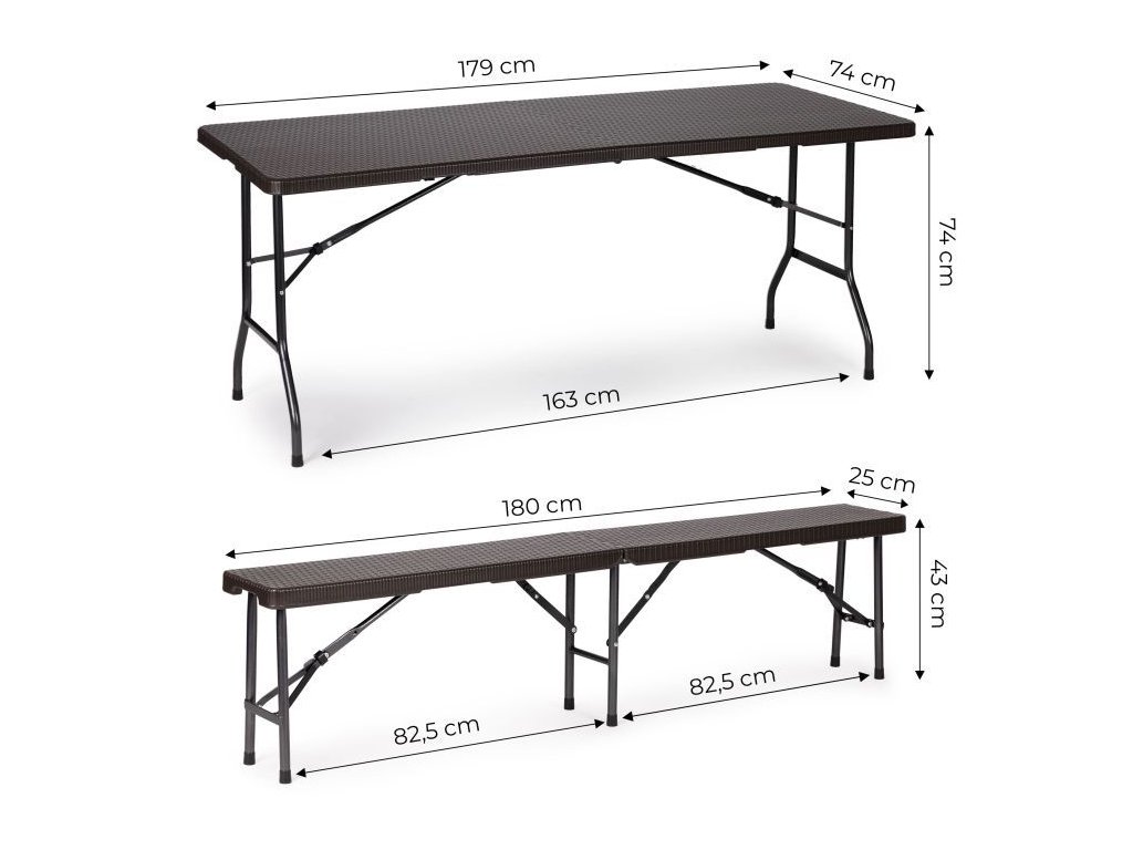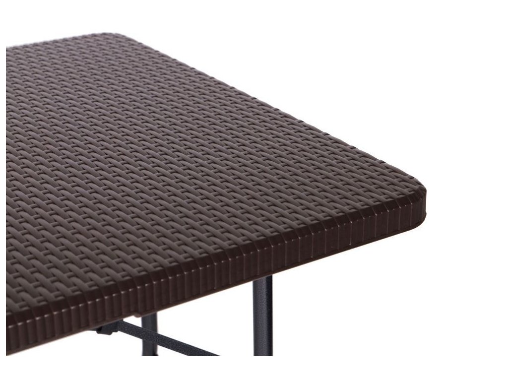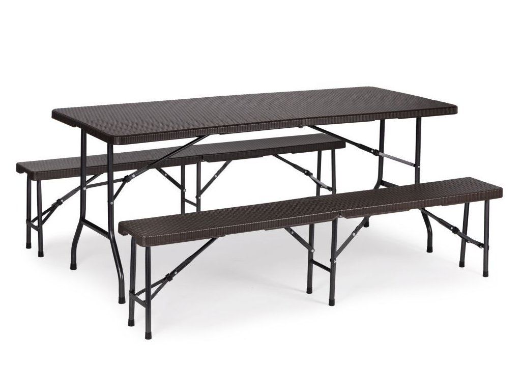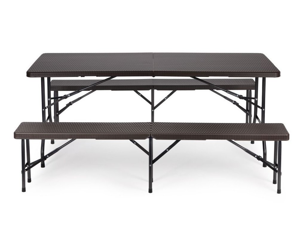 Táto 8-miestna jedálenská súprava pozostáva z cateringového stola a dvoch lavíc . Súprava má pevný kovový rám , zatiaľ čo doska stola a sedadlá v ratanovom štýle sú vyrobené z odolného HDPE . Stôl a lavice majú uzamykací mechanizmus, ktorý zabraňuje náhodnému zloženiu . Súpravu je možné zložiť aj do kufra pre jednoduchú prepravu. Medzi ďalšie vlastnosti patria rukoväte na prenášanie a nohy s ochrannými pätkami. Nábytok je odolný voči poveternostným vplyvom. Nohy stola majú priemer 25 mm a lavice majú priemer 22 mm a maximálne zaťaženie stola je 100 kg.