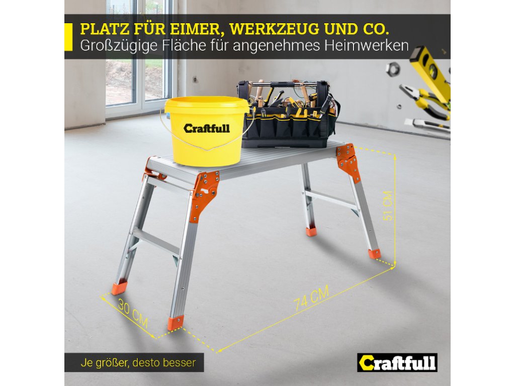 S pracovnou plošinou Craftfull CF-107A platí, že čím väčšia, tým lepšia! Vďaka rozmerom plošiny 74 x 30 cm vám preto ponúka pohodlnú a priestrannú plochu na prácu. Na pracovnú plošinu tak môžete pohodlne umiestniť svoje náradie alebo iné materiály. Výška 51 cm je ideálna aj na dosiahnutie vyšších vecí.