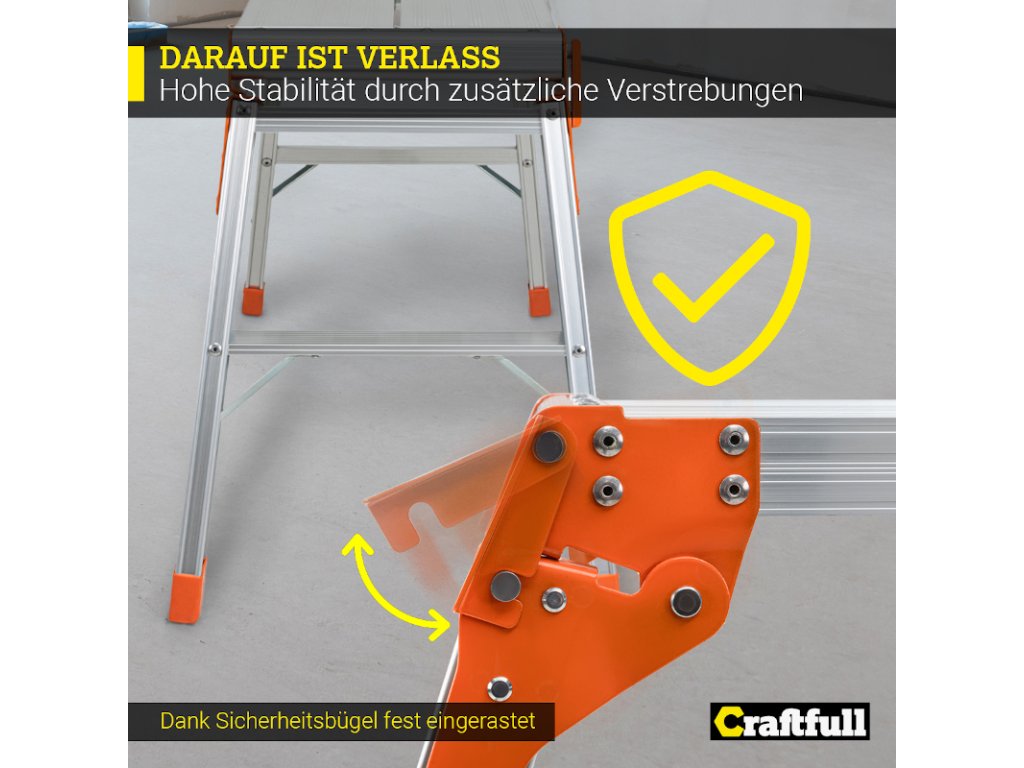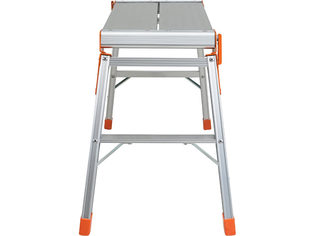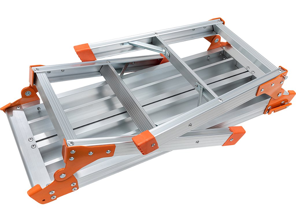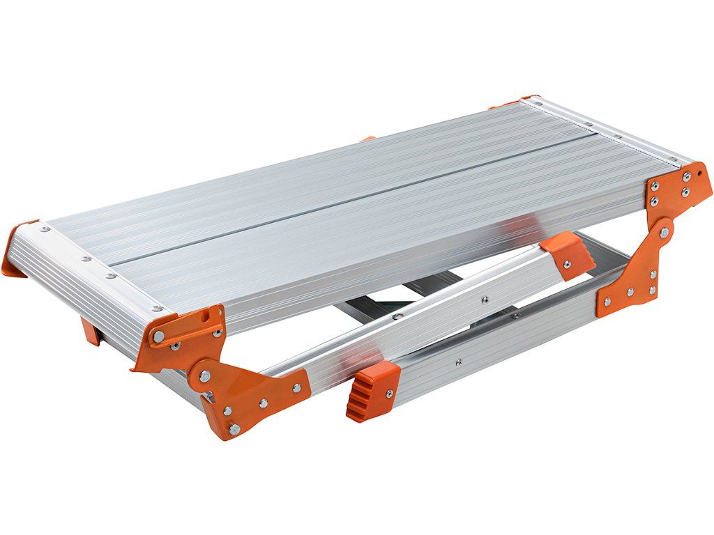 Na priestrannú plochu plošiny môžete umiestniť všetky druhy náradia. Bezpečnostná lišta zabraňuje náhodnému zloženiu a protišmykový nášľap a nožičky zaisťujú pevné postavenie. Prídavné vzpery zaisťujú dodatočnú stabilitu na pracovnej ploche.