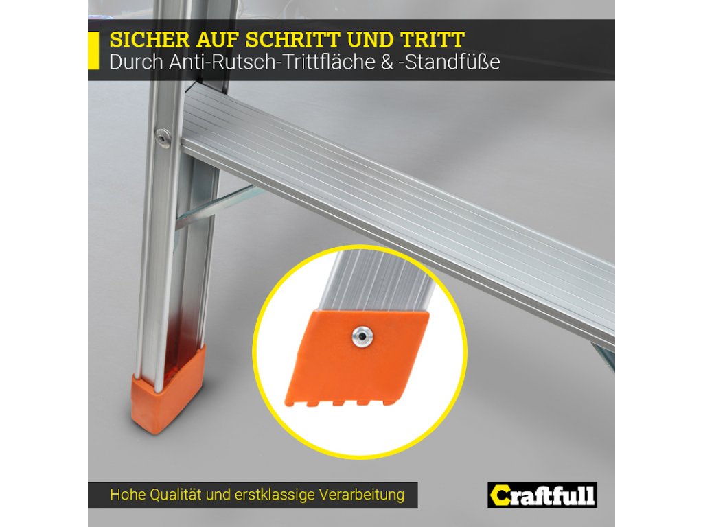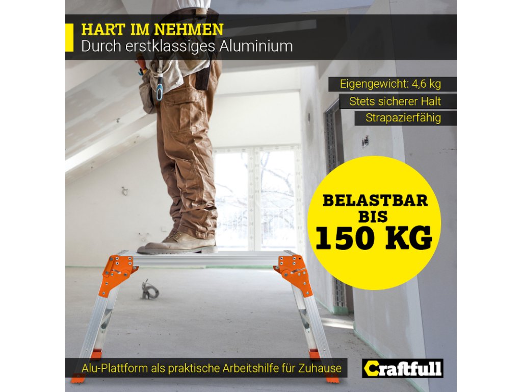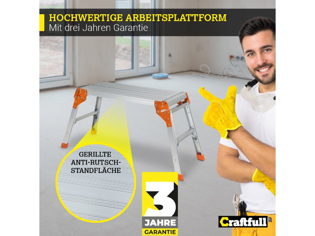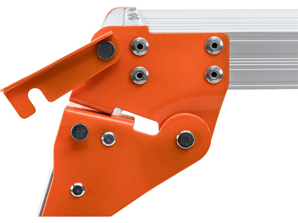 Na priestrannú plochu plošiny môžete umiestniť všetky druhy náradia. Bezpečnostná lišta zabraňuje náhodnému zloženiu a protišmykový nášľap a nožičky zaisťujú pevné postavenie. Prídavné vzpery zaisťujú dodatočnú stabilitu na pracovnej ploche.