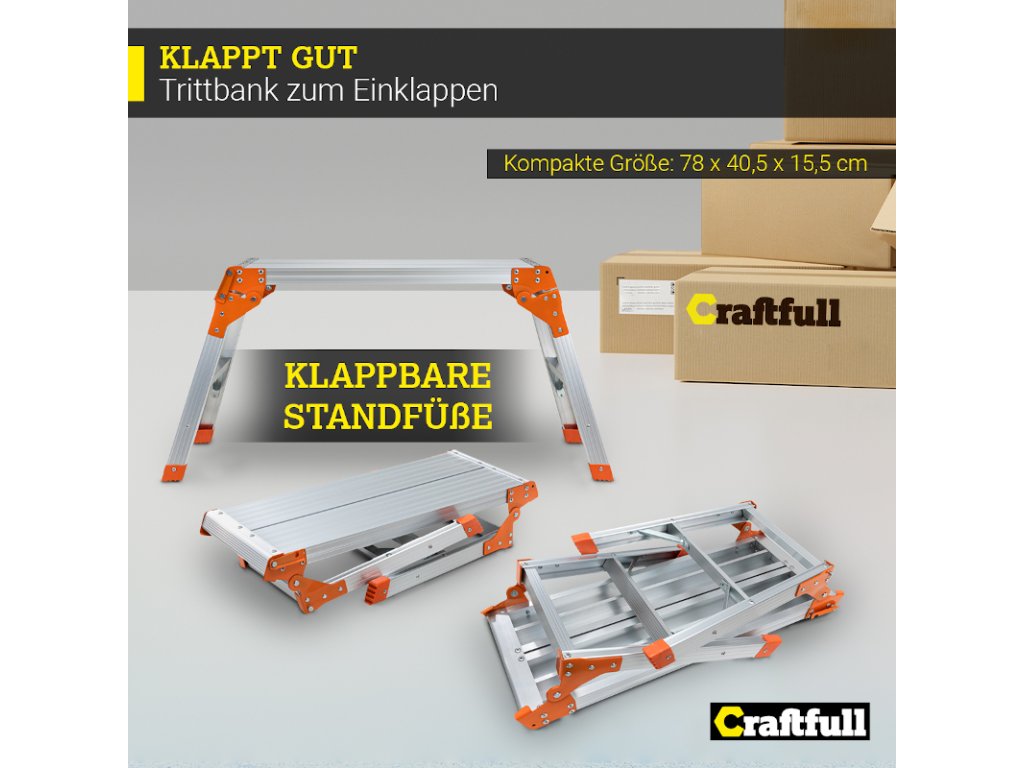 Aby ste nestrácali čas, pracovná plošina Craftfull CF-107A boduje mimoriadne jednoduchou montážou. Rovnako rýchlo sa dá zložiť a rozložiť. Získate mobilné pracovné lešenie, ktoré je okamžite pripravené na použitie. Keď je všetko hotové, zložíte ho extrémne kompaktným spôsobom. Vďaka sklopným nohám sa pracovná plošina zmenší na rozmer 78 x 40,5 x 15,5 cm. A tak ľahko sa zmestí aj do malej záhradnej skrinky.