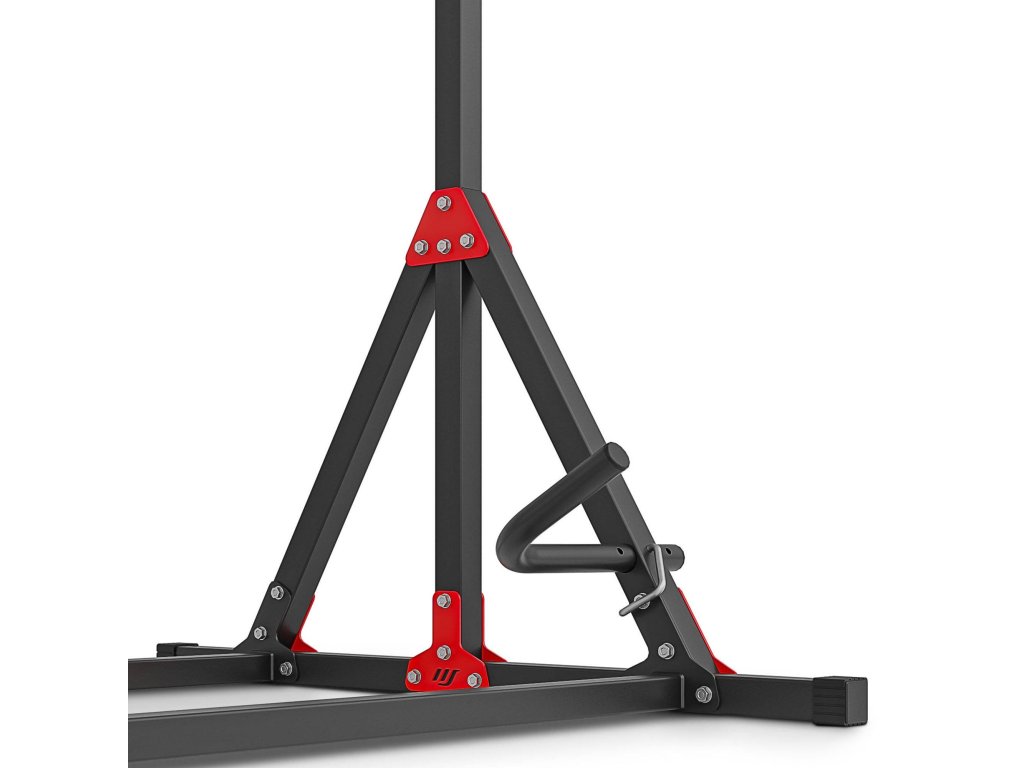 Široká základňa (121 × 102 cm) zaručuje, že hrazda je pevná a nehýbe sa počas tréningu. Plastové nožičky navyše chránia podlahu pred poškriabaním. Ak si stále nie ste istí stabilitou, zariadenie má 4 montážne otvory na ešte väčšie zabezpečenie.