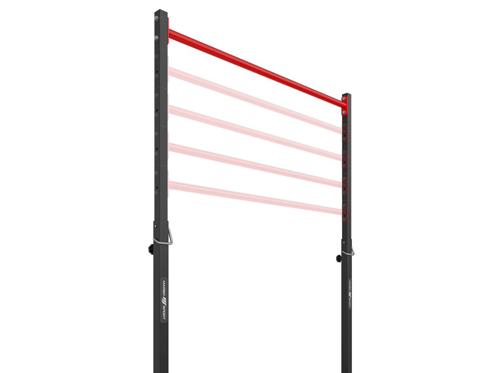 Tyč ponúka 5 úrovní nastavenia výšky od 190 cm do 246 cm, s krokmi po 14 cm. Vďaka tomu si ju môžete prispôsobiť presne podľa svojej výšky a tréningových cieľov.