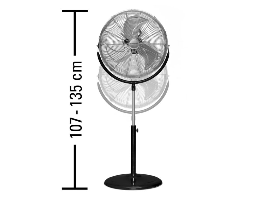 Ventilátor je vybavený teleskopickou tyčou s výškovým nastavením, ktorá umožňuje flexibilné prispôsobenie výšky podľa potrieb používateľa – od nižšej cirkulácie vzduchu pri zemi až po priame prúdenie do vyšších zón miestnosti. Stabilný podstavec zaručuje bezpečné státie aj pri maximálnom výkone, čo oceníte najmä pri dlhšej prevádzke.