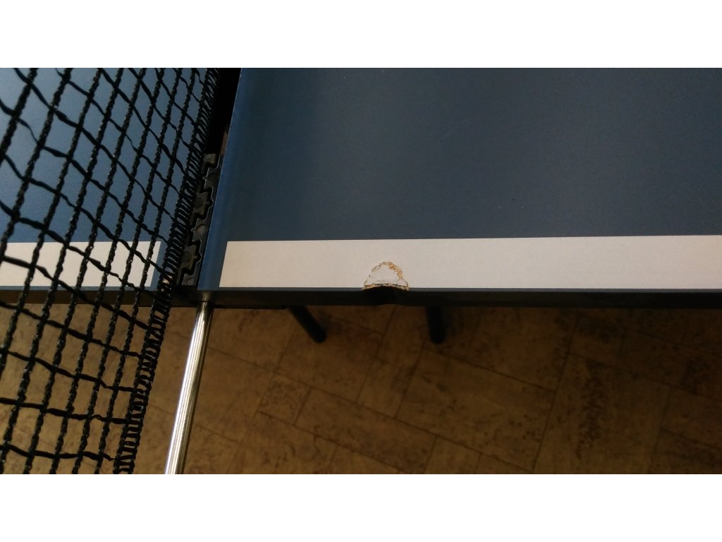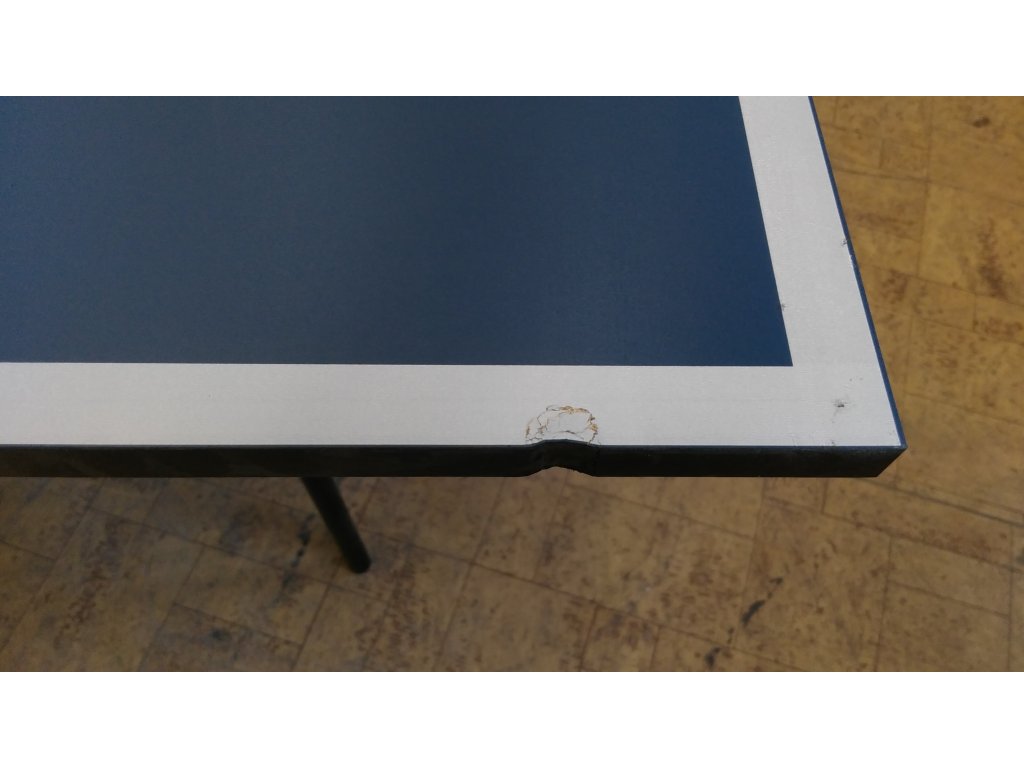 Stolnotenisový stôl S1-53i je nový a nepoužívaný. Pri preprave došlo k poškodeniu na jednej doske na dvoch miestach na bočnej strane dosky (tak ako je vidno na fotkách), čo ale nemá negatívny vplyv na funkčnosť stolnotenisového stola.