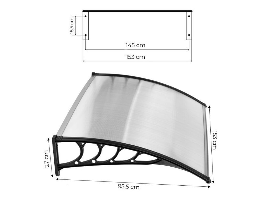 Táto strieška na dvere je funkčné a esteticky príjemné riešenie určené na inštaláciu nad vchodové dvere. Vďaka odolnému polykarbonátu s hrúbkou 0,5 cm účinne chráni vchod pred dažďom, snehom a slnkom. Rám vyrobený z odolného plastu zaručuje trvácnosť a stabilitu. Súčasťou balenia je montážna sada pre jednoduchú inštaláciu. Okrem toho je produkt vhodný aj do komerčných priestorov, kde chráni hostí a zákazníkov pred nepriaznivými poveternostnými podmienkami.