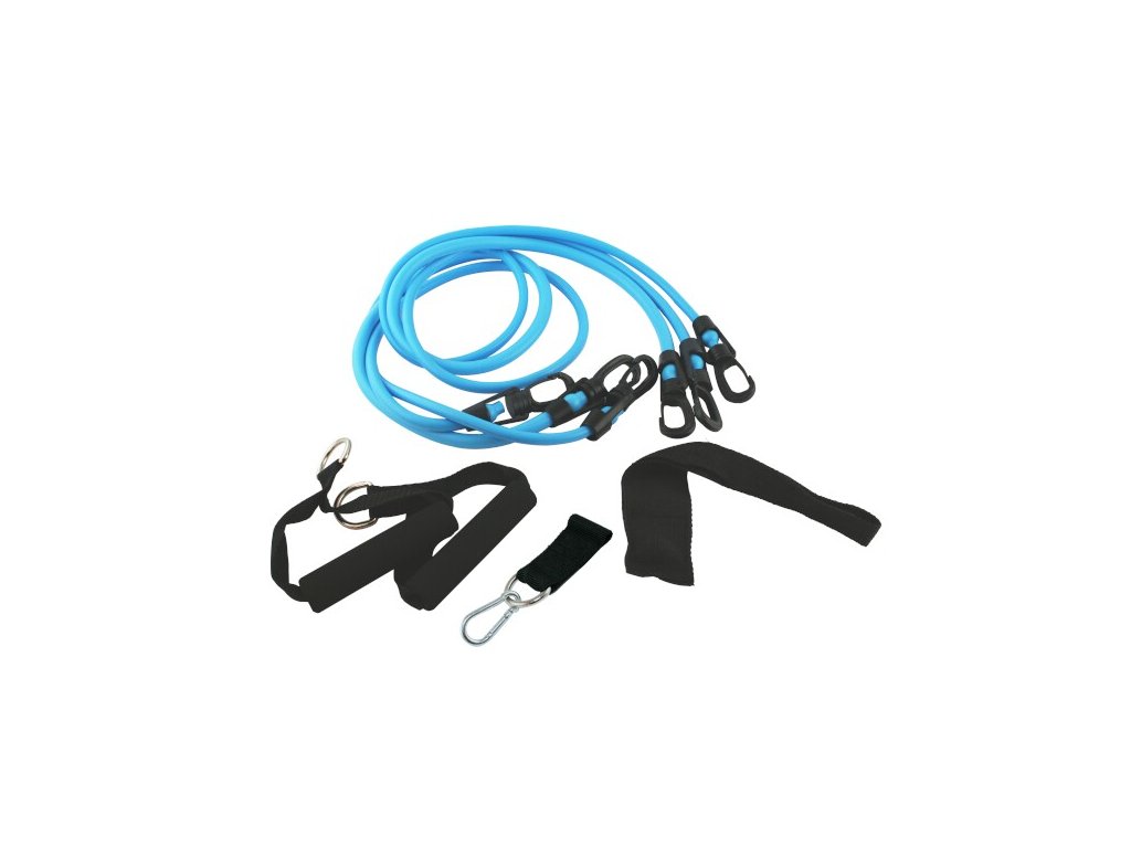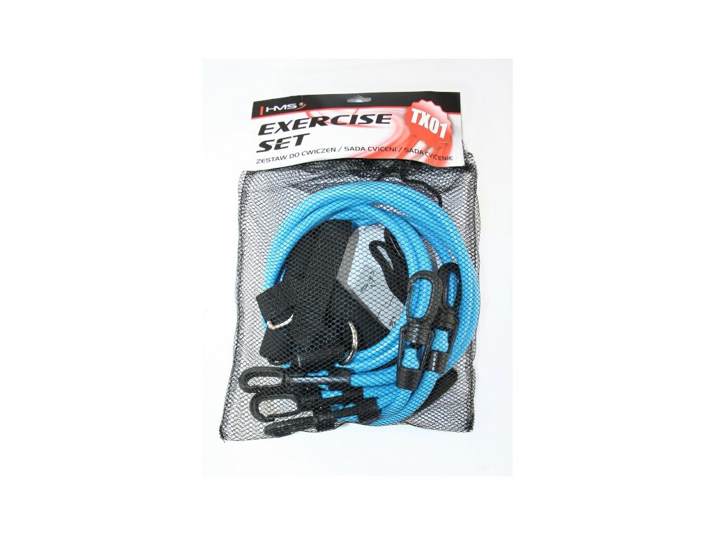 TX01 sada sa skladá z 3 - odporové gumy, 2 - rukoväte 1 - upevnenie k členku, 1 - upevnenie na dvere. Každá dvojica gúm má inú tuhosť, ktorá vám umožní vybrať rôzne úrovne intenzity cvičenia. Na každej z gúm môže byť rukoväť, čo umožňuje realizáciu komplexného tréningu všetkých svalových skupín.