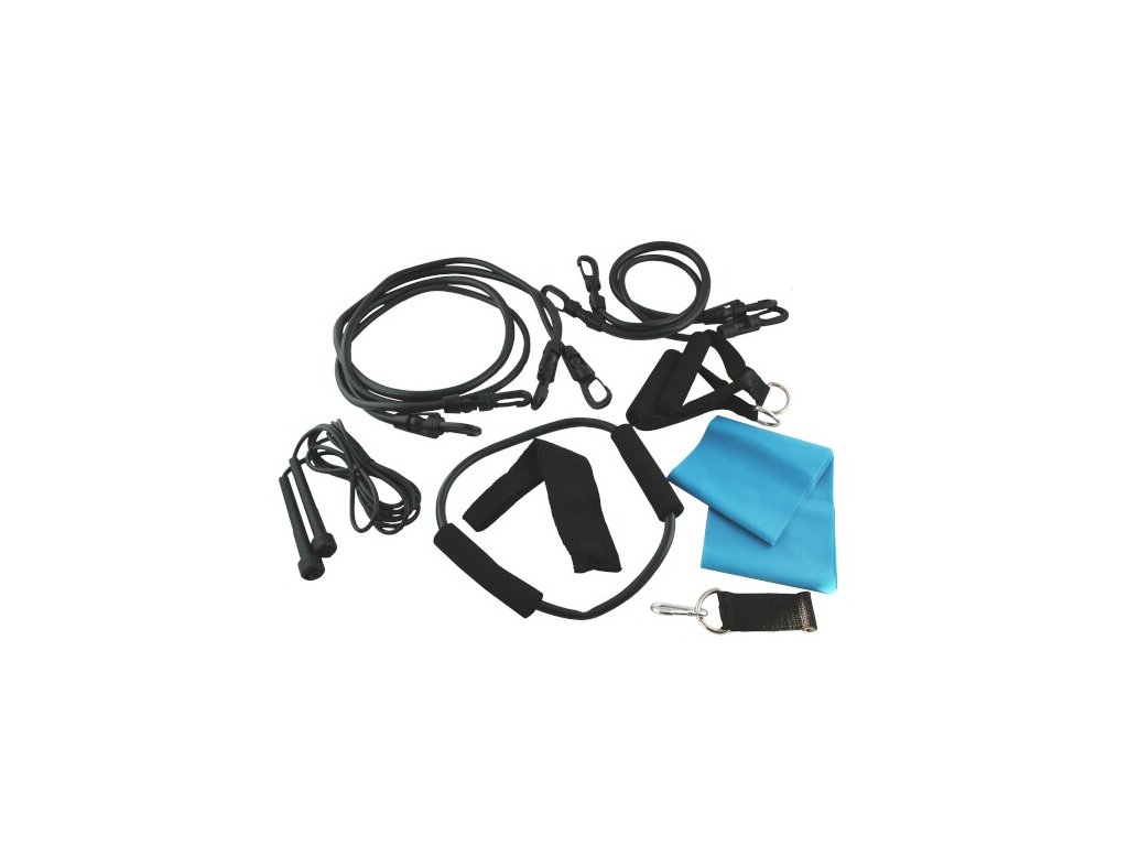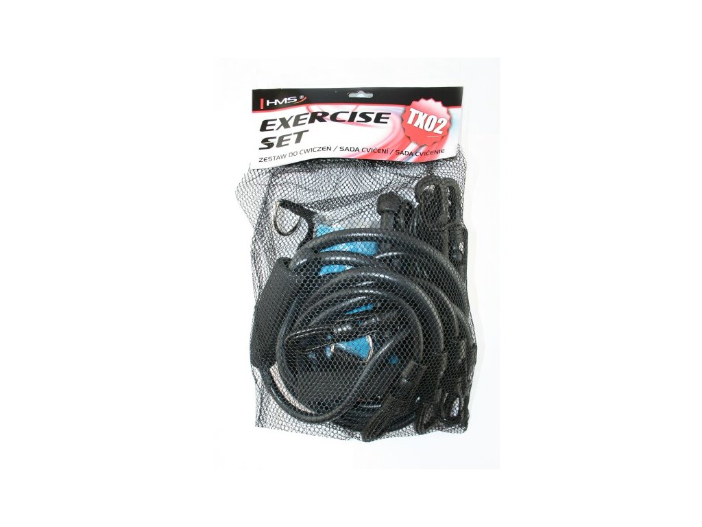 TX02 Sada sa skladá zo 4 - odporové gumy, 1 - elastický pás, 1 - upevňovací pás, 2 - rukoväte 1 - upevnenie k členku, 1 - upevnenie na dvere, švihadlo. Každá dvojica gúm má inú tuhosť, ktorá vám umožní vybrať rôzne úrovne intenzity cvičenia. Na každej z gúm môže byť rukoväť, čo umožňuje realizáciu komplexného tréningu všetkých svalových skupín.