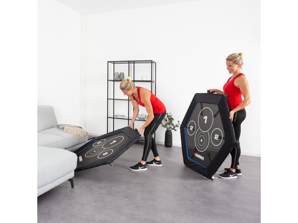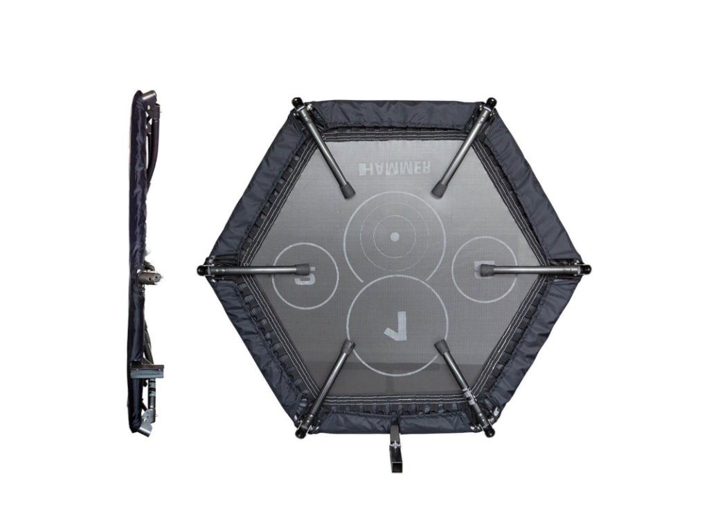 Bonusom HAMMER Fitness Cross Jump je skladací mechanizmus. Nohy trampolíny je možné ľahko a rýchlo sklopiť pomocou tlačidla. Rukoväť je odnímateľná. Po zložení trampolína dosahuje výšku max 10 cm a ľahko ju tak upratáte pod posteľ, za skriňu alebo oprite o stenu.