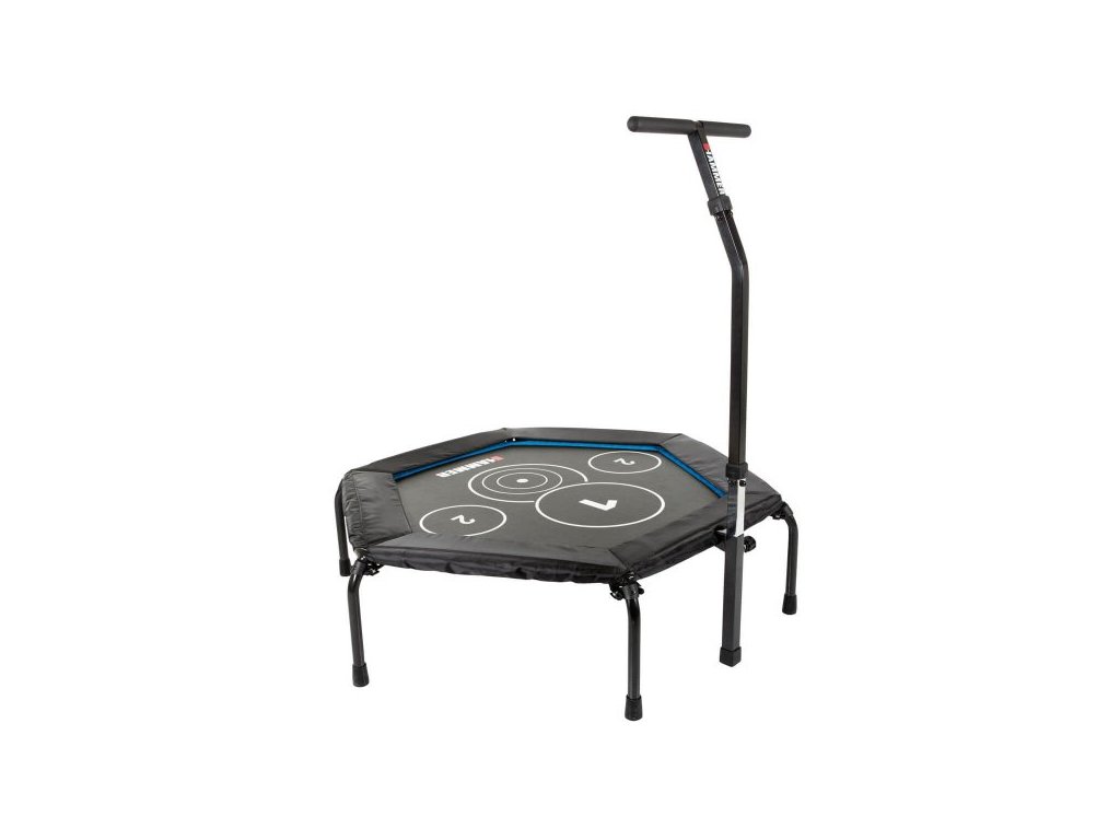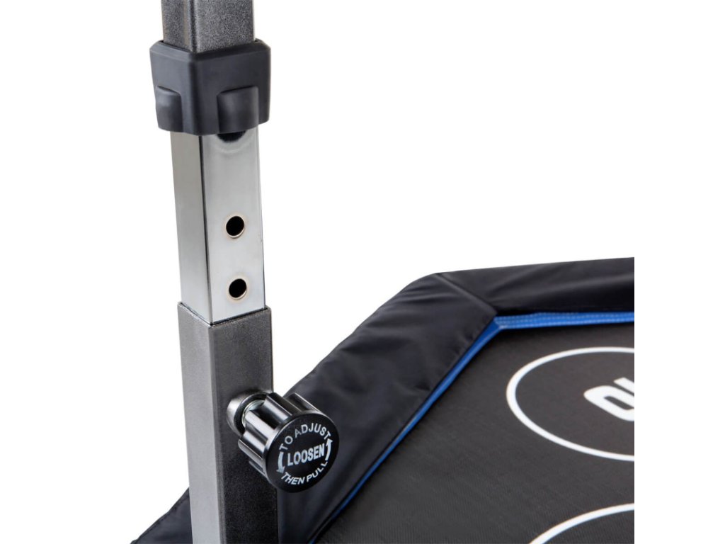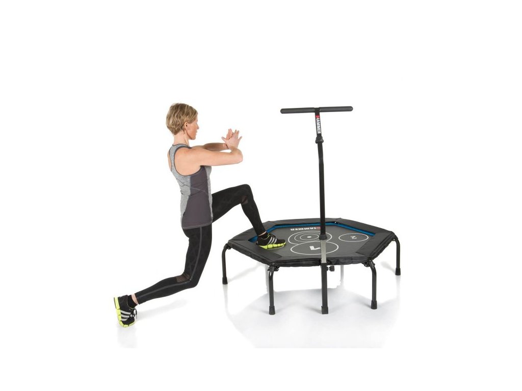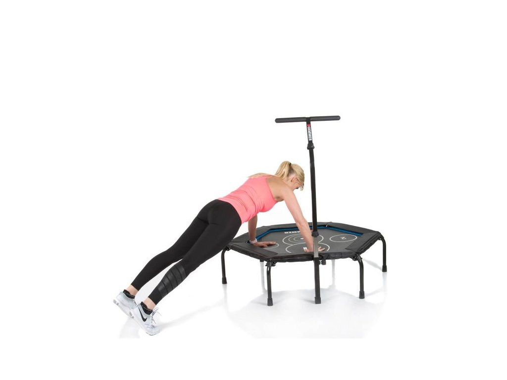 Bezpečnosť predovšetkým. Bezpečnostný kryt, ktorý sa ľahko odstráni alebo naopak nasadí, zabráni skákaniu na hranu. Výškovo nastaviteľná rukoväť v rozmedzí 137 - 116 cm má polstrované madlo a predstavuje bezpečnostný prvok nielen pre začiatočníkov. Zaisťuje pocit stability aj pri vykonávaní rýchlejších a náročnejších cvikov. Protišmykové gumové nožičky udržujú trampolínu v stabilnej polohe, bez ohľadu na náročnosť tréningu.