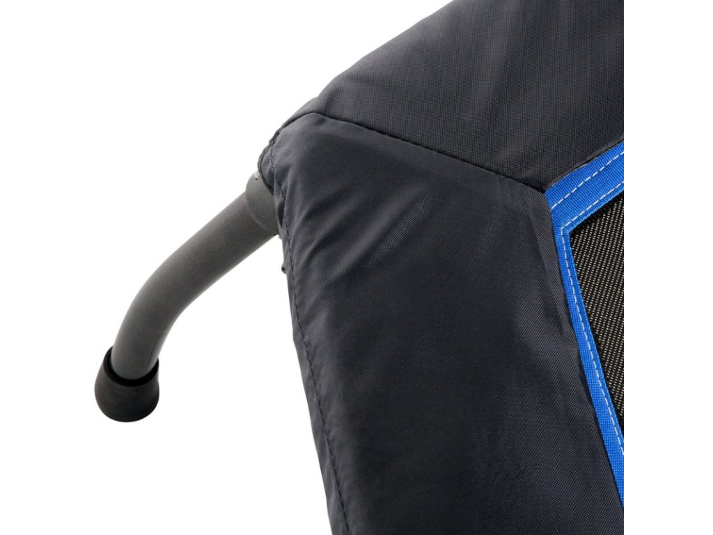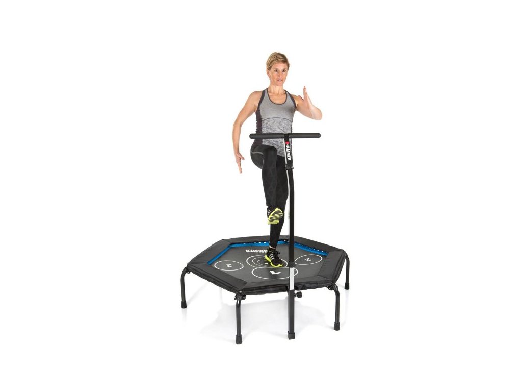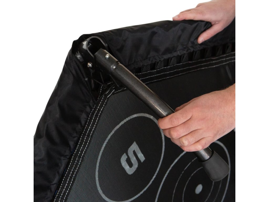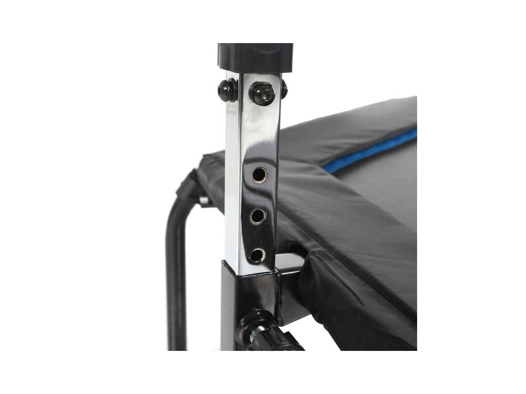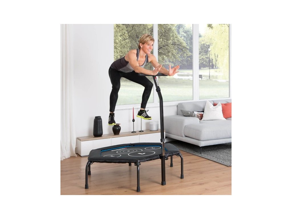 Bezpečnosť predovšetkým. Bezpečnostný kryt, ktorý sa ľahko odstráni alebo naopak nasadí, zabráni skákaniu na hranu. Výškovo nastaviteľná rukoväť v rozmedzí 137 - 116 cm má polstrované madlo a predstavuje bezpečnostný prvok nielen pre začiatočníkov. Zaisťuje pocit stability aj pri vykonávaní rýchlejších a náročnejších cvikov. Protišmykové gumové nožičky udržujú trampolínu v stabilnej polohe, bez ohľadu na náročnosť tréningu.
