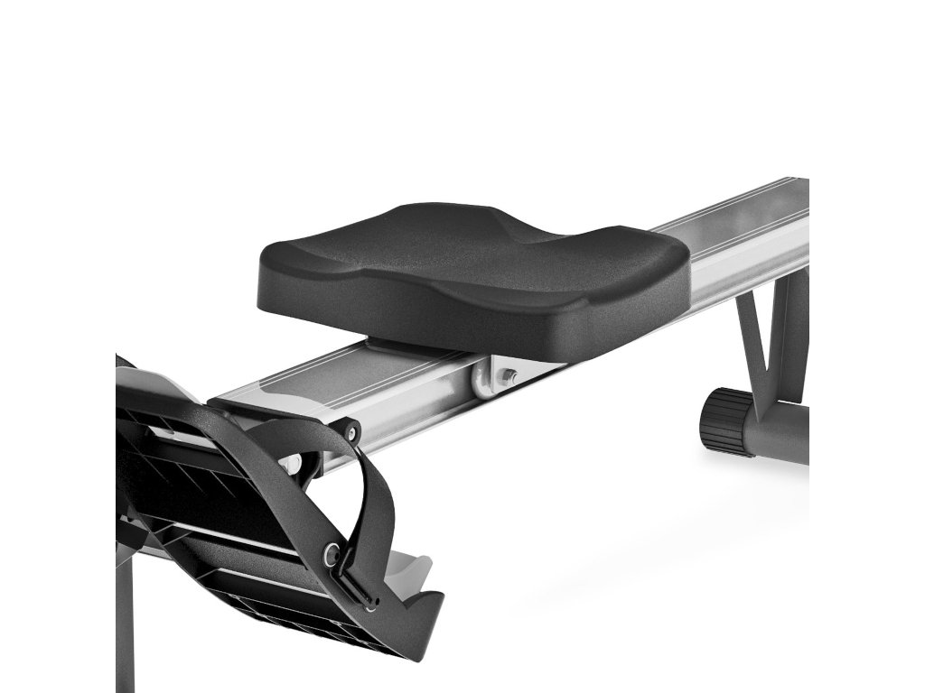 Dizajn veslovacieho trenažéra je navrhnutý tak, aby ponúkal maximálny komfort a praktickosť. Valčekové sedadlo vybavené guľôčkovými ložiskami sa hladko kĺže po dráhe 110 cm, čo zaisťuje hladký a prirodzený pohyb. Nastaviteľné opierky nôh sú vybavené popruhmi na nohy, ktoré zaisťujú stabilnú a bezpečnú polohu počas používania, prispôsobujú sa rôznym veľkostiam nôh.