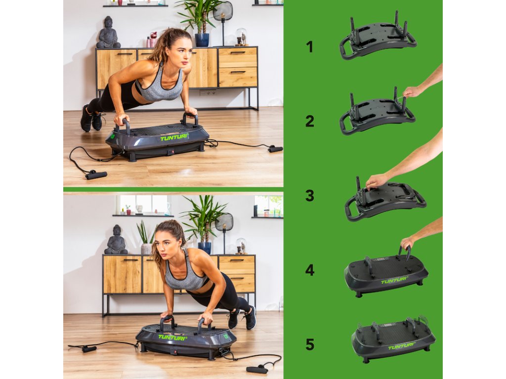 Vibračná doska má tri polohy: oscilácia, vibrácie a kombinácia oboch. Vibrácia znamená, že doska ide hore a dole rýchlym tempom. Oscilácia je švihový pohyb. Oboje zaisťuje vyvedenie tela z rovnováhy a núti svaly sa napínať, aby udržali rovnováhu. To vám umožní precvičiť mnoho svalových skupín bez zložitých cvikov. Táto kombinácia vytvára trojrozmerný cvičebný efekt pre maximálnu výzvu. Vibračná doska je tiež vynikajúca pre menej intenzívny program, ako je relaxácia po cvičení.