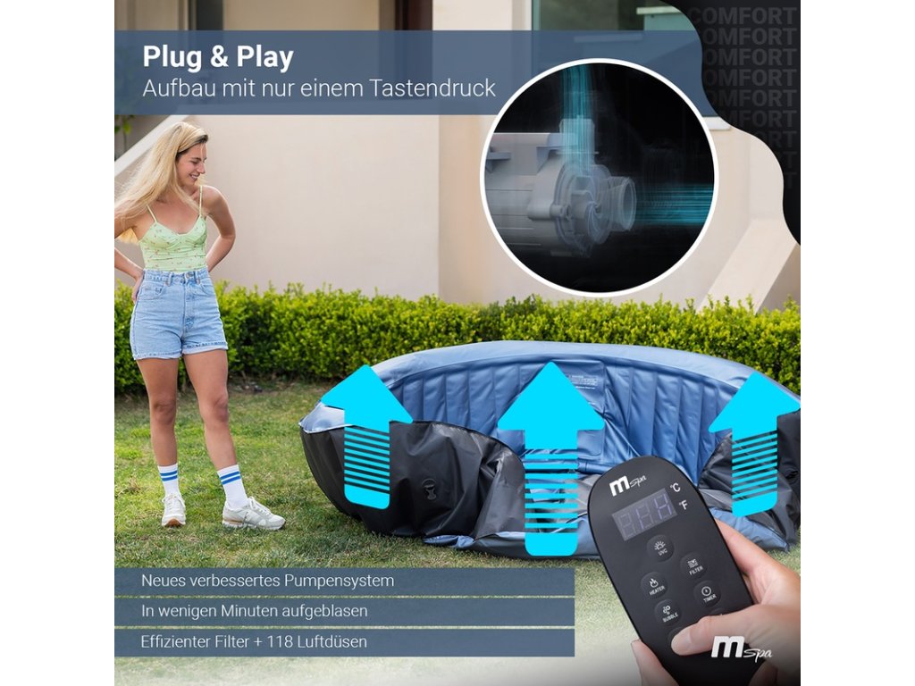 Odradí vás predstava prácneho nafukovania vírivky od jej kúpy? Potom pre vás máme skvelú správu! Ak chcete nafúknuť svoju nafukovaciu vírivku, stlačte tlačidlo bublín na diaľkovom ovládači a zároveň sledujte tlakomer. Keď sa po približne troch minútach dosiahne požadovaný tlak vzduchu vďaka technológii rýchleho nafukovania, jednoducho znova stlačte tlačidlo bublín. Teraz už len stačí naplniť vírivku vodou a vaša nafukovacia vírivka je pripravená na použitie. Nové modely Comfort, rovnako ako model Bergen, majú pumpovací systém, ktorý je o 53 % menší, o 15 % ľahší a o 29 % výkonnejší ako predchádzajúce modely!