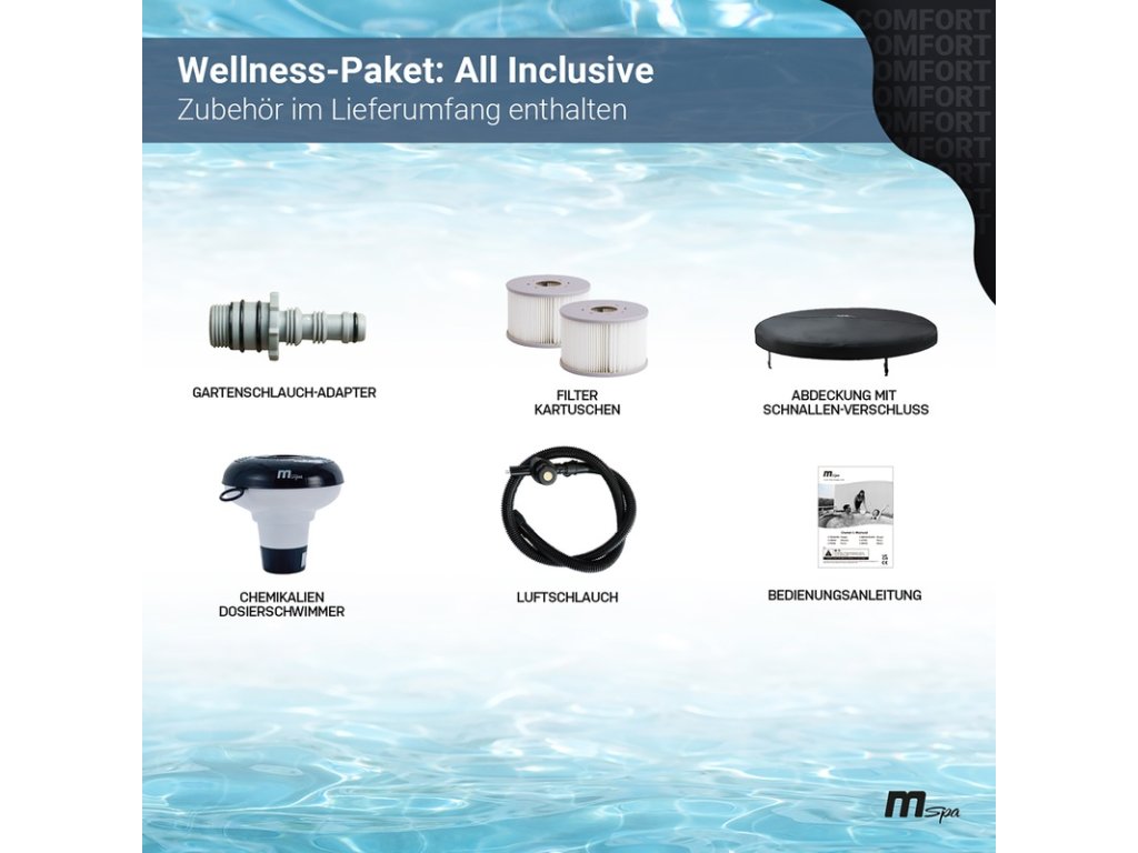 Balenie obsahuje: vírivku, kryt bazéna s upevňovacími prackami, plavák na dávkovanie chemikálií, 2x filtračné patróny, plniaca hadica s manometrom, adaptér na záhradnú hadicu