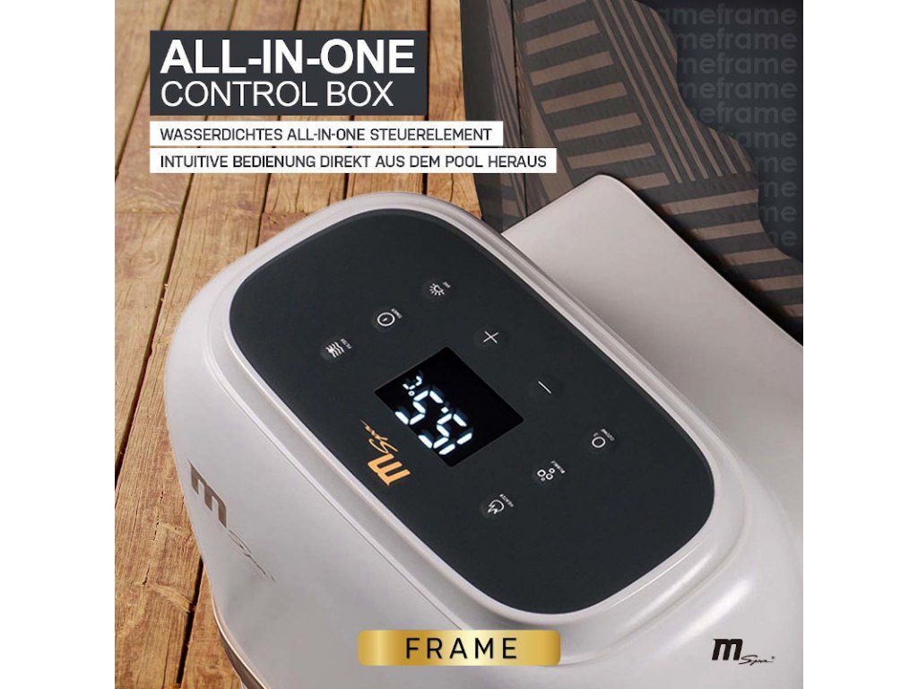 Ovládať množstvo funkcií pohodlne z nafukovacej vírivky? Žiaden problém! Mono z produktovej série MSpa Frame vám ponúka ovládaciu skrinku typu všetko v jednom s mierne zošikmeným a prehľadným ovládacím panelom. Vodotesné ovládacie zariadenie s elegantným dizajnom je umiestnené na vonkajšej strane bazéna a možno ho ovládať intuitívne. Vďaka jeho extra veľkému displeju všetko dobre prečítate aj na ostrom slnku. Navyše je vodeodolný a teda chránený pred dažďom a bazénovou vodou. Ovládací box okrem iného riadi hygienické technológie bazéna, teda UV-C svetlo a generátor ozónu, funkciu vírivky a ohrev bazéna.