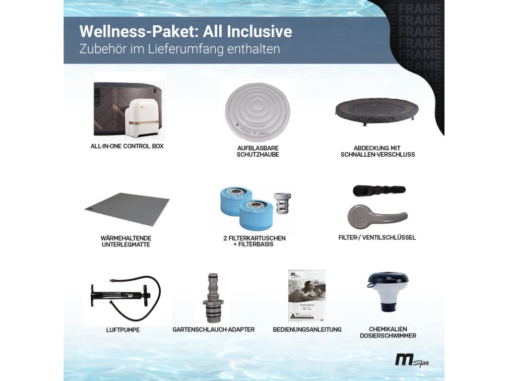 Balenie obsahuje: vírivku, kryt bazéna s upevňovacími prackami, tepelná ochranná rohož EVA, nafukovací kryt, dávkovač chemikálií, 2x filtračné kazety, vzduchové čerpadlo, plniaca hadica, adaptér na záhradnú hadicu