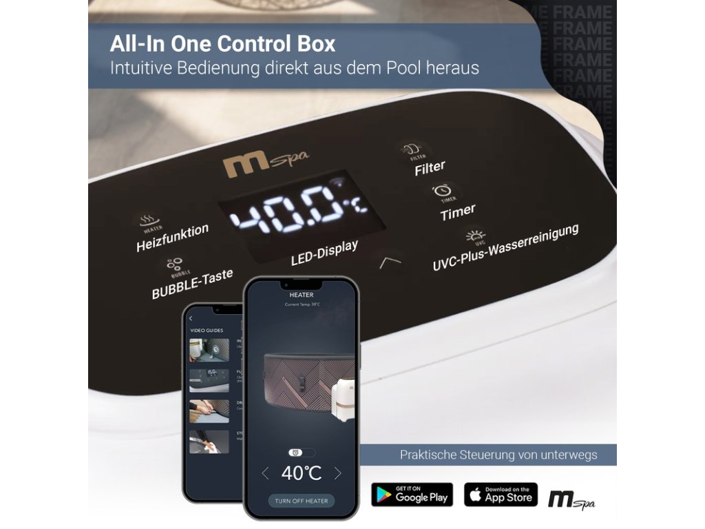 Chcete pohodlne ovládať množstvo funkcií z vašej nafukovacej vírivky? Žiadny problém! Mono z produktovej rady MSpa Frame vám ponúka komplexný ovládací panel s mierne nakloneným a prehľadným ovládacím panelom . Vodotesná ovládacia jednotka s elegantným dizajnom sa nachádza mimo bazéna a je intuitívna na používanie . Vďaka extra veľkému displeju si všetko prečítate aj na silnom slnečnom svetle. Navyše je vodotesná , a preto chránená pred dažďom a bazénovou vodou. Ovládací panel okrem iného ovláda hygienické technológie bazéna, t. j. UVC+ svetlo, funkciu vírivky a ohrev bazéna.