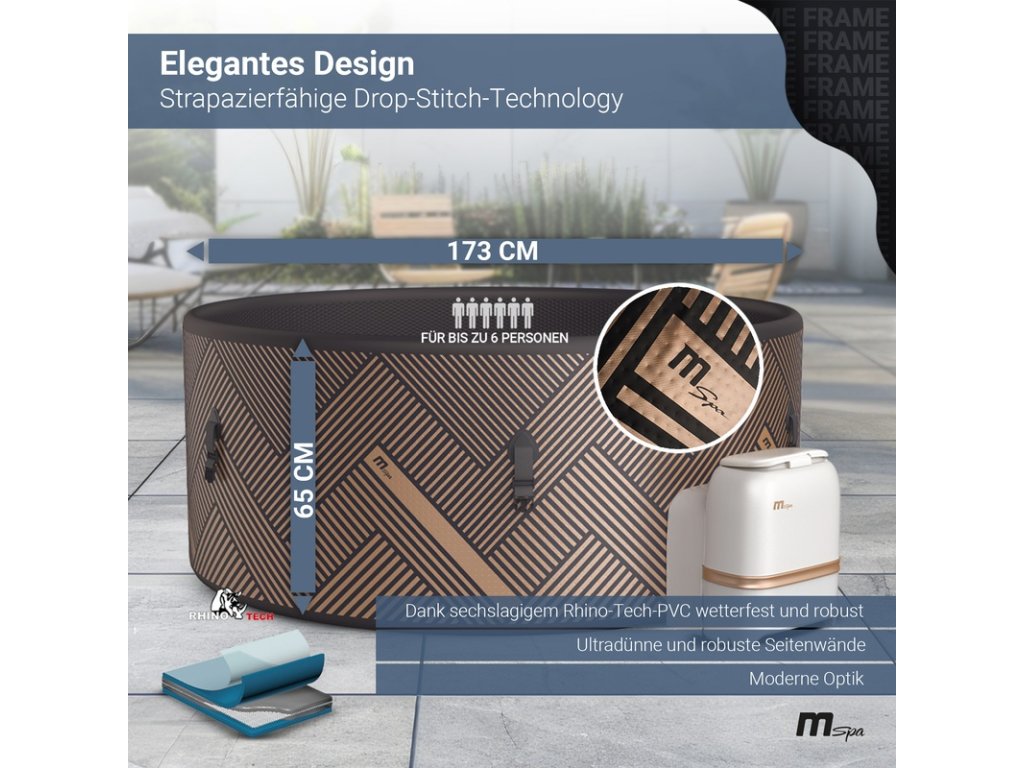 Vírivka Miweba MSpa Mono je mimoriadne robustná a zároveň ľahká vďaka extra hrubému 6-vrstvovému materiálu Rhino-Tech a inovatívnemu procesu drop-stitching. Proces drop-stitching bezpečne a pevne spája vrstvy materiálu pomocou početných polyesterových nití. Materiál Rhino-Tech tejto inovatívnej dvojstennej záhradnej vírivky umožňuje ultratenké bočné steny s vysokou stabilitou. Materiál však dokáže ešte viac: je veľmi šetrný k pokožke, chráni vonkajšiu vírivku pred UV žiarením a mrazom a zároveň sa môže pochváliť atraktívnym dizajnom.