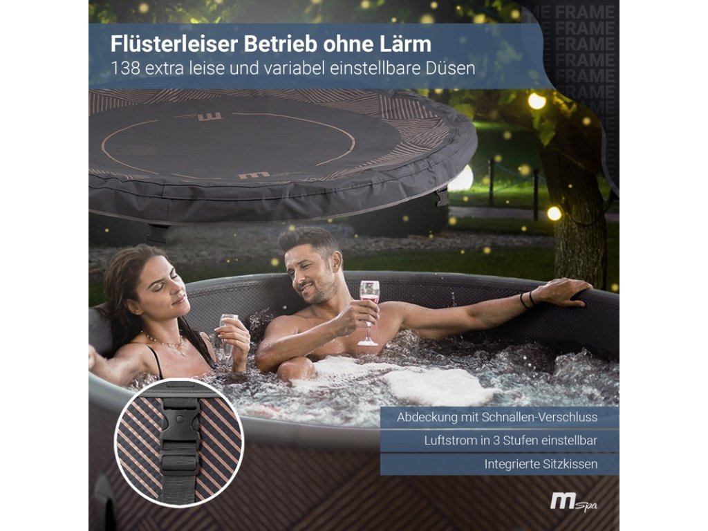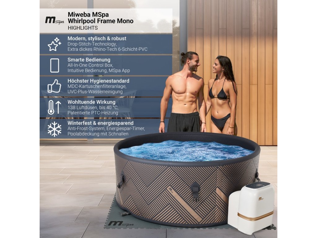 S vyhrievanou vírivkou Miweba MSpa Mono až pre šesť osôb si užijete veľa zábavy a užívania si na dlhý čas. Mono je nafukovací vírivý bazén. Je robustný a zároveň pohodlný. Vďaka mimoriadne odolnej tkanine je vhodný aj do náročných prostredí. Zároveň je veľmi ľahký a ľahko sa prepravuje. 138 dynamických vzduchových trysiek s tromi úrovňami intenzity zabezpečuje skvelý zážitok z kúpania. Dezinfekcia UVC+ svetlom ponúka najvyššiu úroveň hygieny. Vďaka vodeodolnému a ľahko použiteľnému multifunkčnému ovládaciemu panelu môžete pohodlne využívať mnoho funkcií počas kúpania vo vašej záhradnej vírivke. Nič vám teda nestojí v ceste relaxačnému dňu.