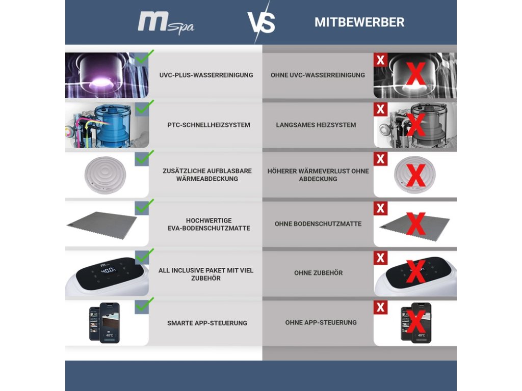 Naše vírivky si budete užívať dlho. V bezpečí ste však iba vtedy, ak sa spoľahnete na originálne príslušenstvo. Pamätajte, že neoriginálne diely a príslušenstvo nie sú spoločnosťou Mspa testované ani schválené a spoločnosť Miweba nemôže posúdiť ich vhodnosť a bezpečnosť, a to ani pre samotné diely, ani pre ich vplyv na funkčnosť a spoľahlivosť, ako je tepelná ochrana alebo účinnosť filtra . Škody spôsobené použitím neoriginálneho príslušenstva, ako sú filtre, kryty, tepelné ochranné rohože, alebo nesprávnym používaním sú vylúčené zo záruky.