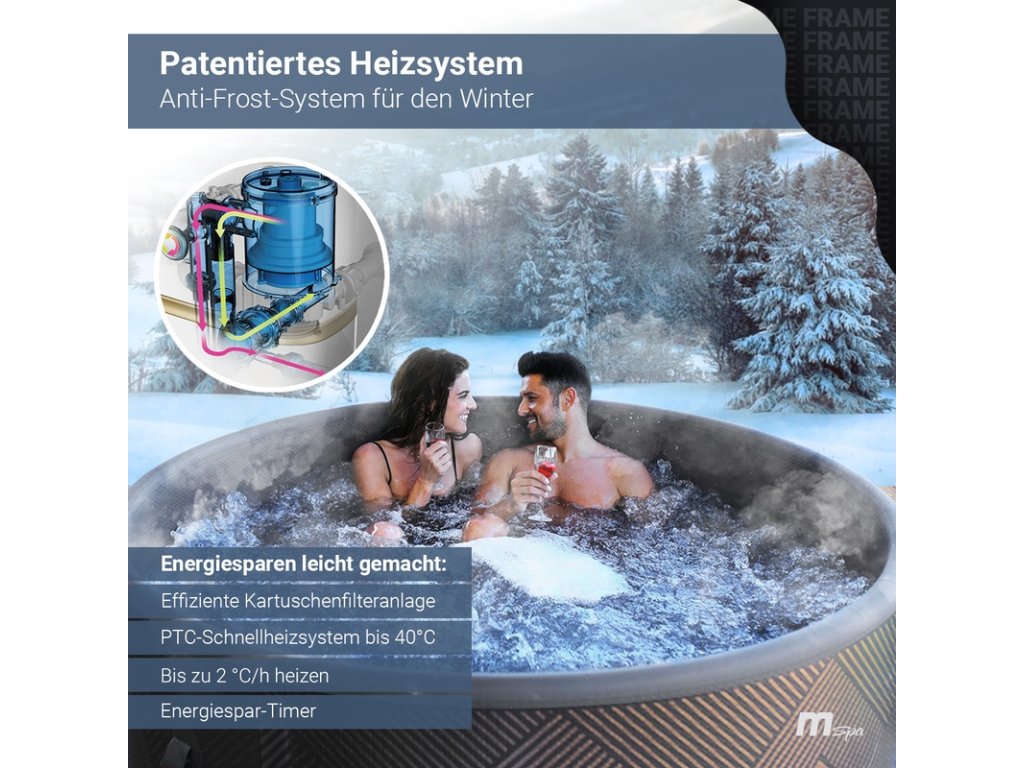 Keď sa kúpanie stane horúcim potešením aj v zimných mesiacoch: Moderná technológia vykurovania vírivky Miweba MSpa Mono to umožňuje. Systém rýchleho ohrevu PTC je vybavený energeticky úsporným, vysoko výkonným keramickým vykurovacím telesom. Jednoducho nastavte požadovanú teplotu na stupnici od 20 do 40 stupňov. Ohrievač sa potom postará o zvyšok a ohrieva vodu v bazéne až o dva stupne Celzia za hodinu. Vďaka tomu je to jeden z najrýchlejších vykurovacích systémov medzi vonkajšími vírivkami. Akonáhle teplota vody dosiahne požadovanú hodnotu, zostane konštantná. Takže sa budete cítiť pohodlne počas celého kúpeľa.