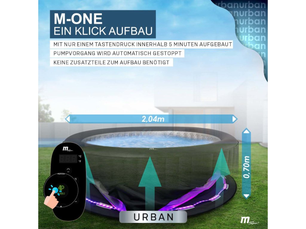 Vírivka Miweba MSpa Aurora predvádza maximálny komfort pri montáži. Vďaka systému M-ONE je vírivka nielen nafukovacia: dá sa nafúknuť obzvlášť rýchlo. Celý proces je dokončený len za päť minút. Jednoducho zapojte napájanie a potom stlačte súčasne tlačidlá „BUBBLE“ a „UP“. Integrovaný manometer počas nafukovania monitoruje tlak vzduchu a zastaví prívod vzduchu hneď, ako sa dosiahne optimálna úroveň tlaku a pôžitok môže začať.