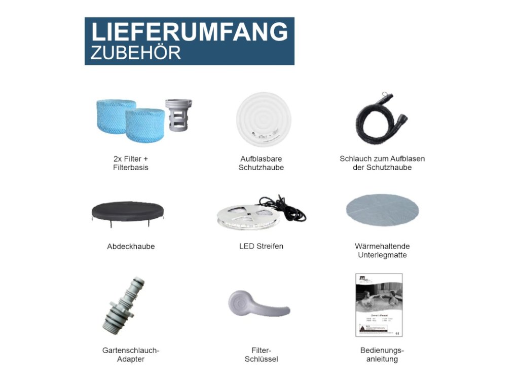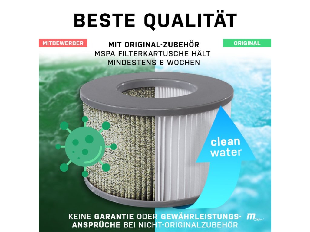 S našimi vírivkami si užijete veľa zábavy na dlhú dobu. Istotu si však môžete byť len vtedy, ak stavíte na originálne príslušenstvo. Nezabúdajte, že neoriginálne diely a príslušenstvo nie sú testované ani schválené spoločnosťou Mspa a že Miweba nemôže posúdiť ich vhodnosť a bezpečnosť pre samotné diely, ani vplyv na funkčnosť a spoľahlivosť, ako je tepelná ochrana alebo účinnosť filtrácie. Poškodenie spôsobené použitím neoriginálneho príslušenstva, ako sú filtre, kryty, tepelné ochranné rohože alebo nesprávnym použitím, je vylúčené zo záruky.